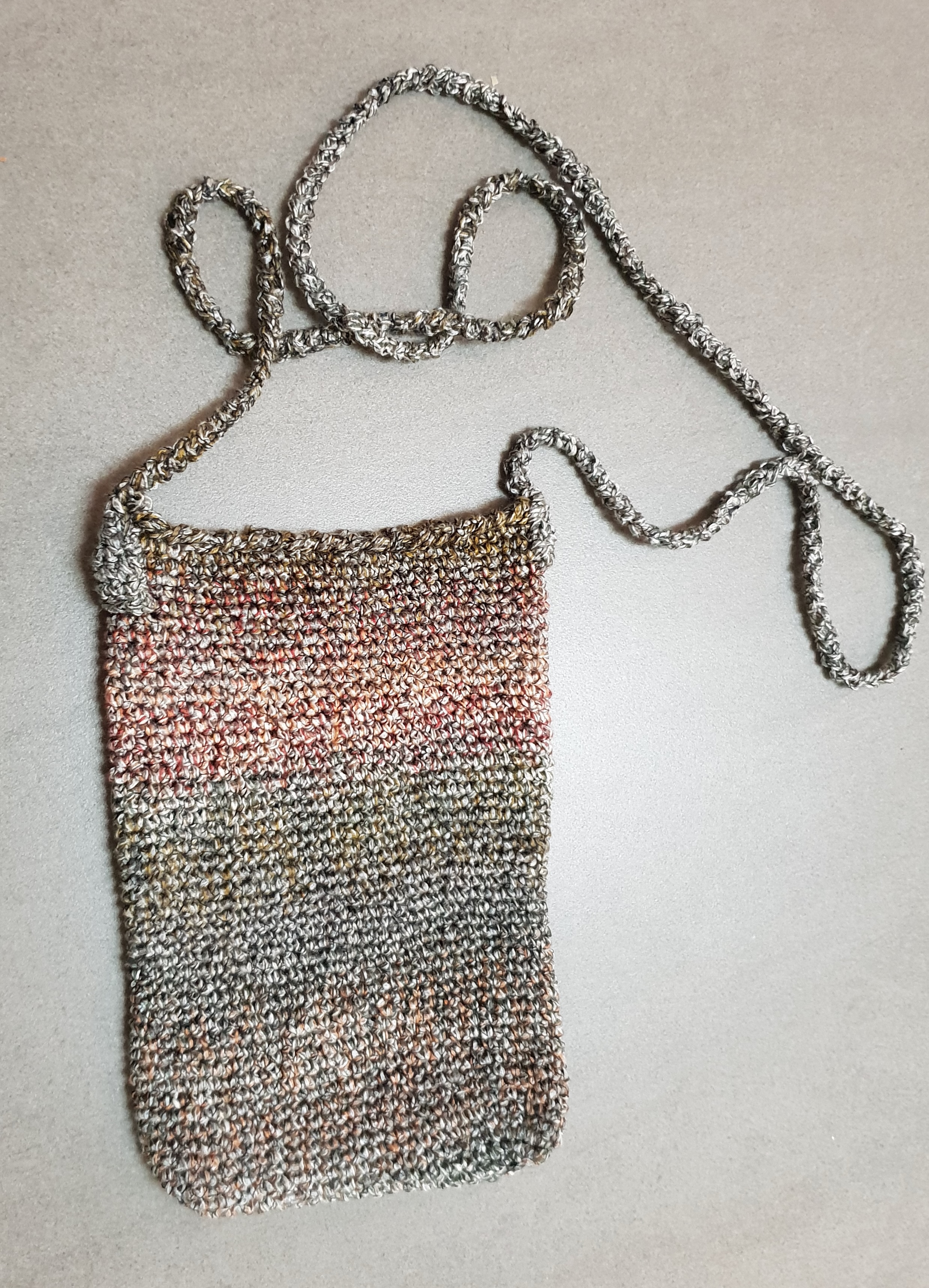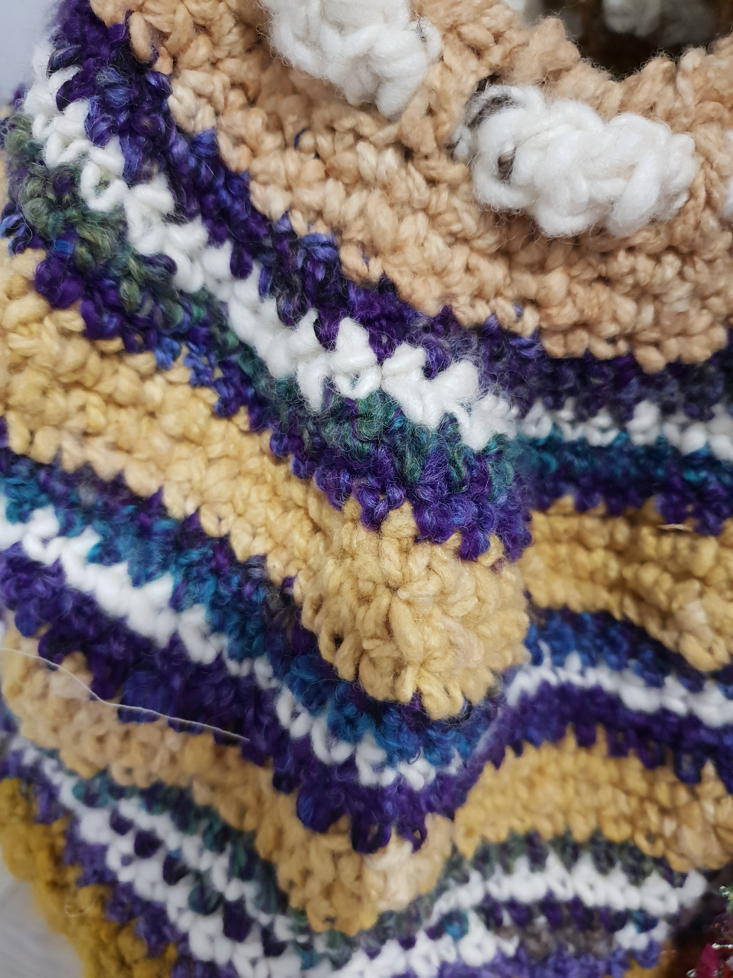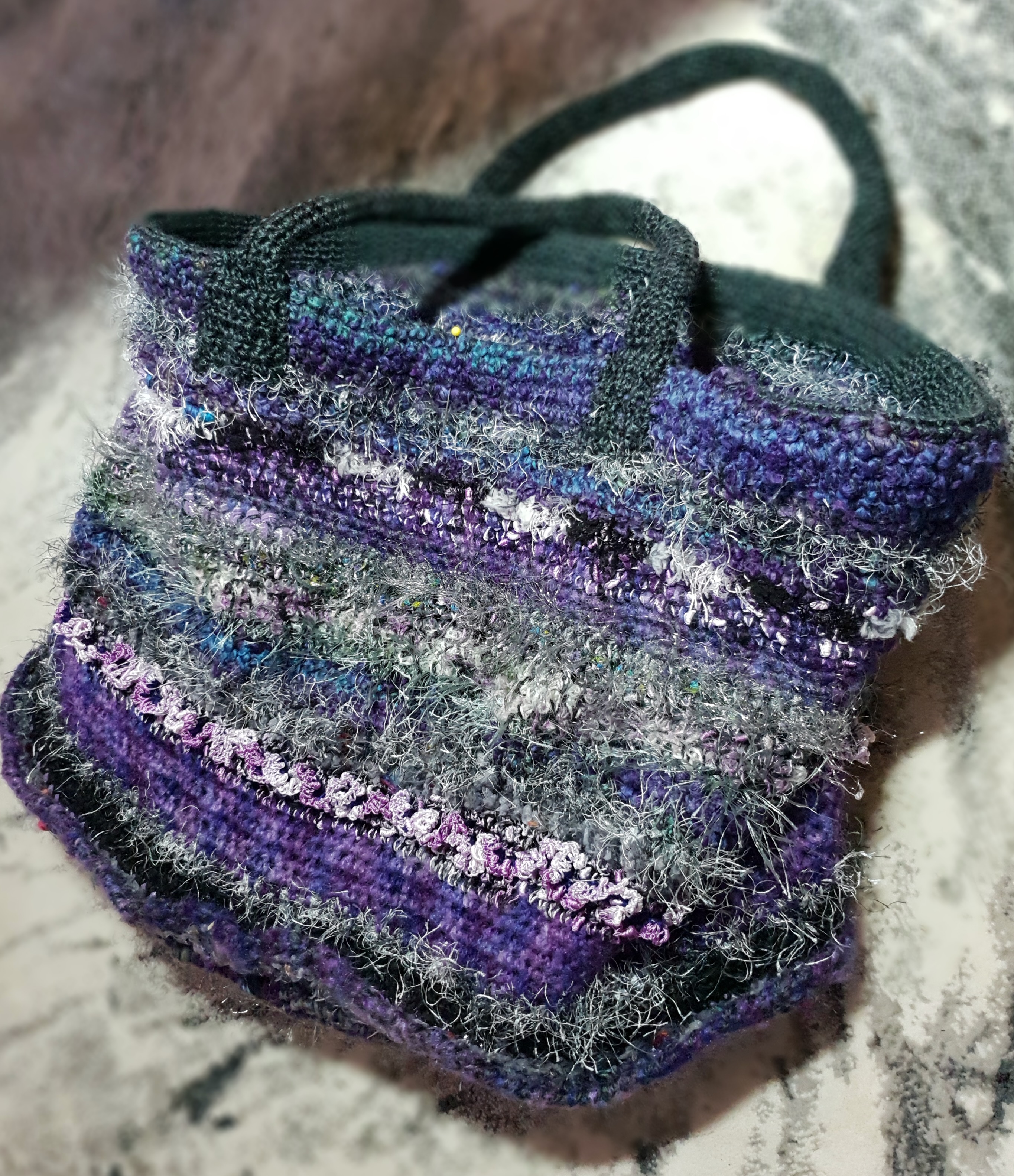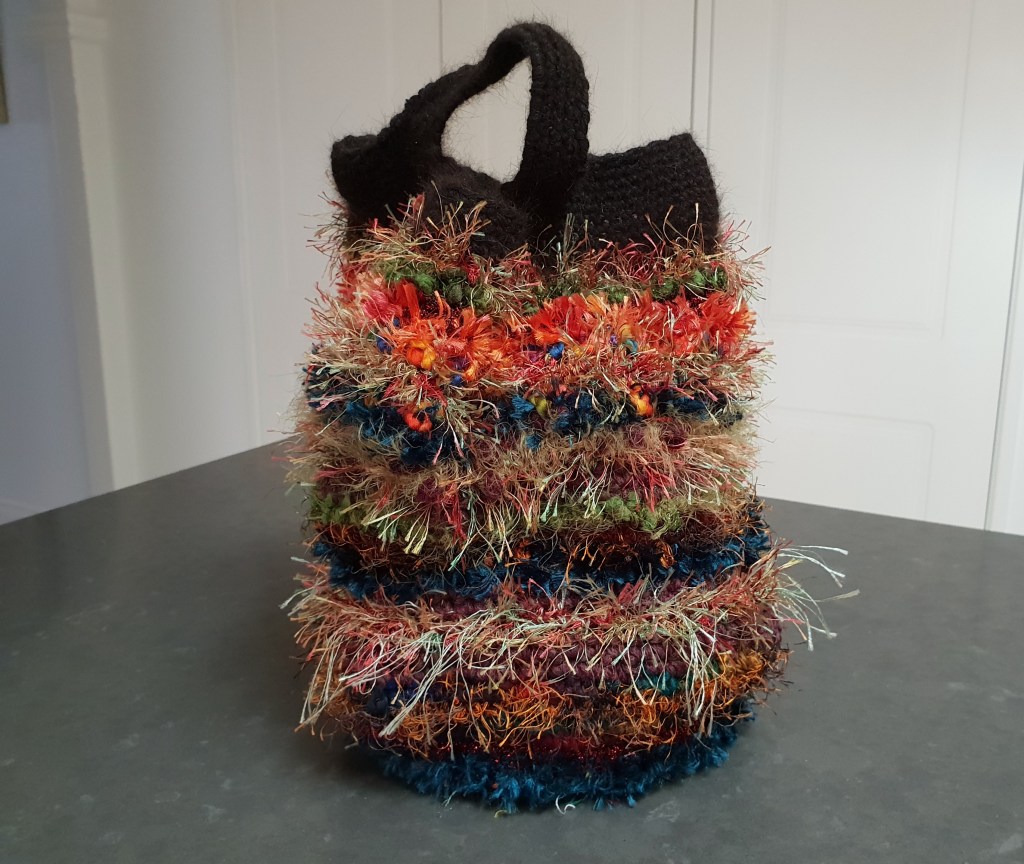 This was one of the first. A large bag that actually informed the colour scheme for a refurbished family room! All double crochet (US single crochet) with yarns combined when necessary to maintain the weight As a switch from chunky to fine, I plied some very fine hand-dyed weft threads bought in weaving villages in West Timor with commercial embroidery threads to make a pouch for the mobile phone and the credit card when walking….the cord is a Romanian lace braid.This phone bag was sheer indulgence in using colour. I haven’t ever used it because it’s so lairy.! Again, the cord is a Romanian lace braidI strengthened the base of this larger bag by cutting thick cardboard from a box of wine and covering it with plastic wrap so it wouldn’t absorb water if any was around. Then I encased the base in black fabric and inserted it into the bottom of the bag. The bag handles are lovely. The consist of a spiral crocheted cord with a flange on each end. This makes it easy to sew the handle neatly onto the bag. Instructions? See this youtube video: youtube.com/watch?v=7dKQ-gP2U6A&t=31sThe bottom of the bag above.Detail of the bag above.A cute little bag made for a Secret Santa in one of my textile groups.There is REALLY thick yarn in this one. Spot the hair of my Rag Doll cat!A bag trio. The one on the right looks very sad. It once had a purpose which was to hold lots of yarn but since I put more cupboards in it hasn’t had a real job.Sometimes bags become vessels! How? When the one in the first image on this post is stuffed! Quite sculptural.