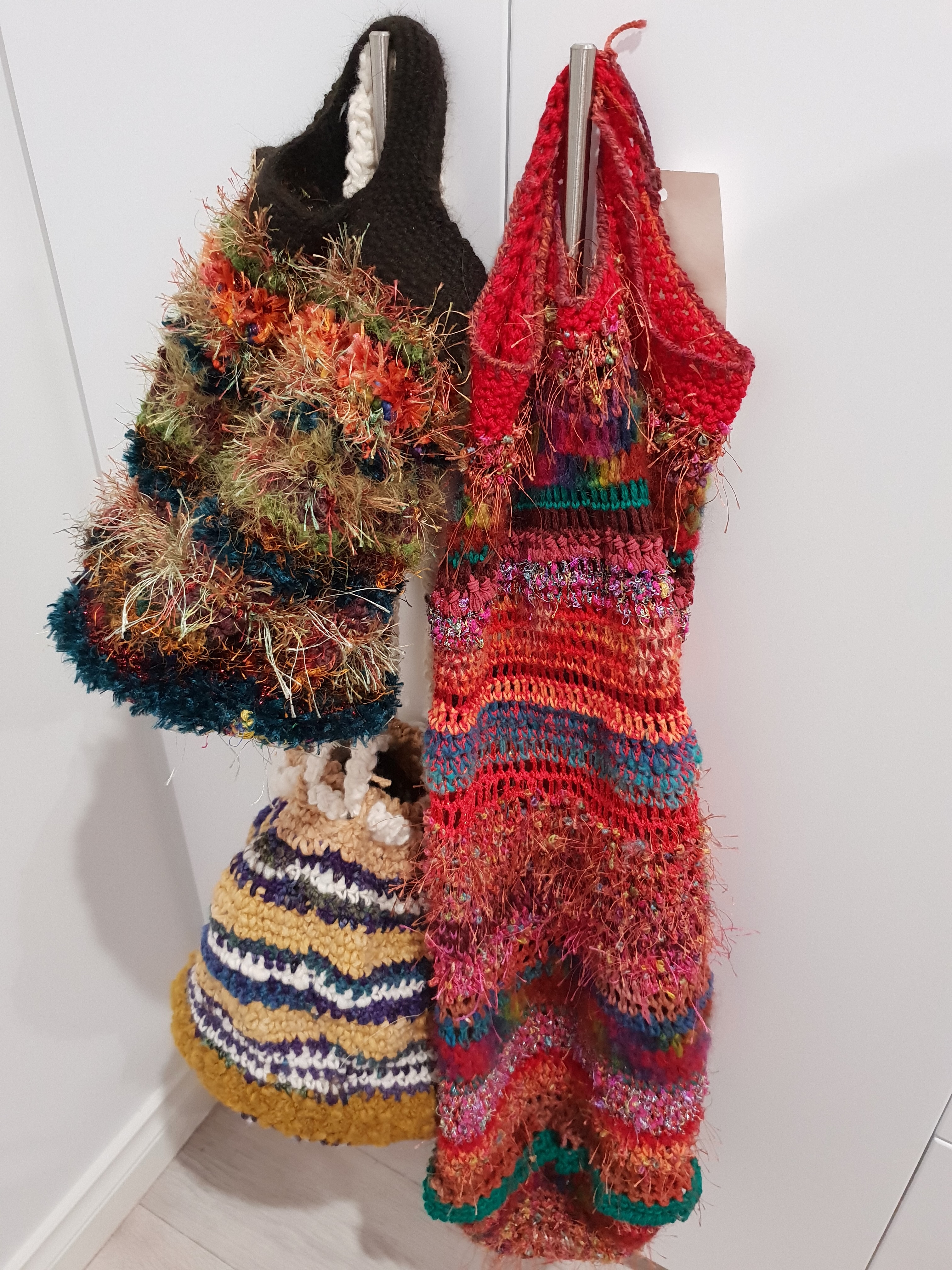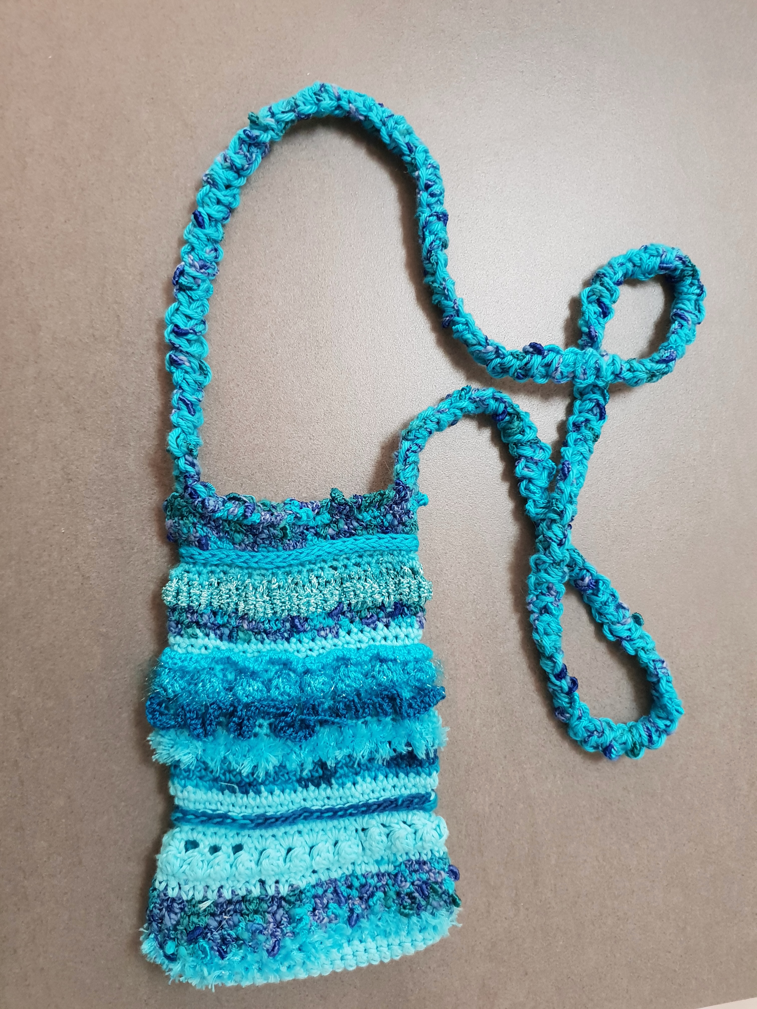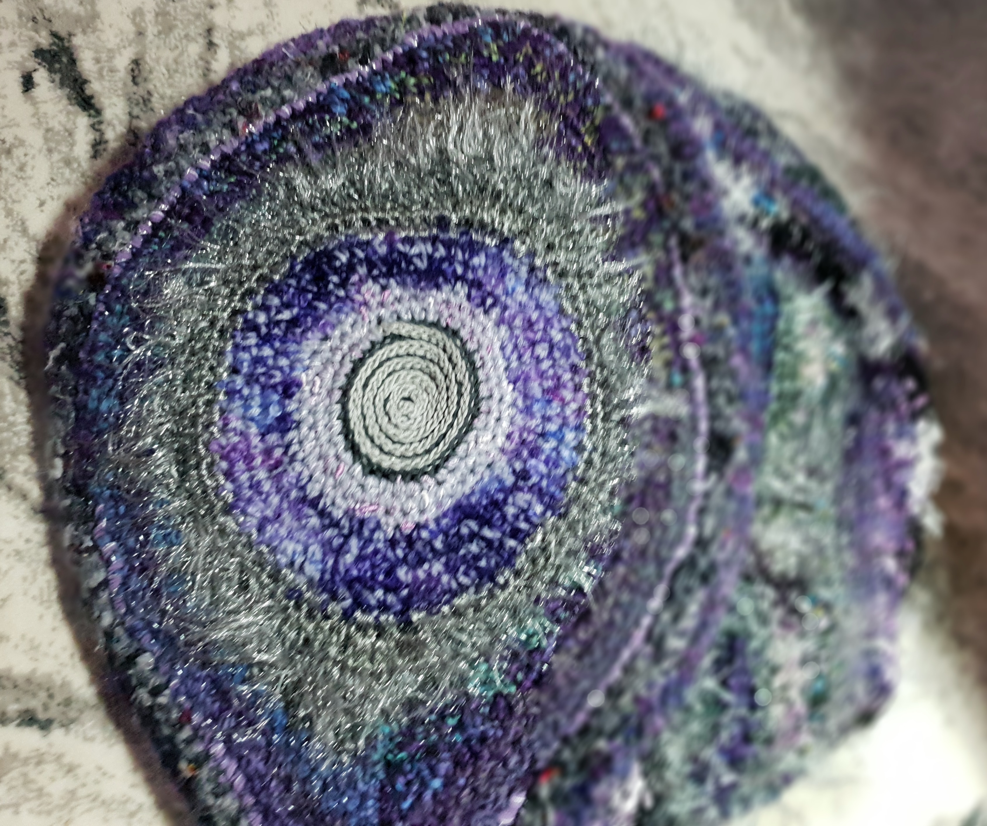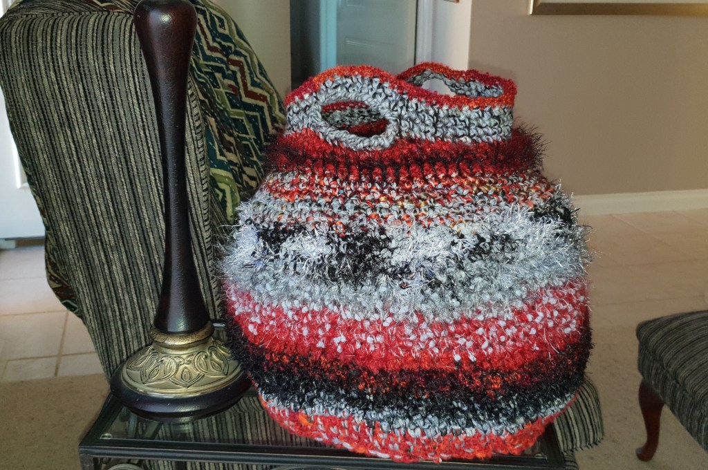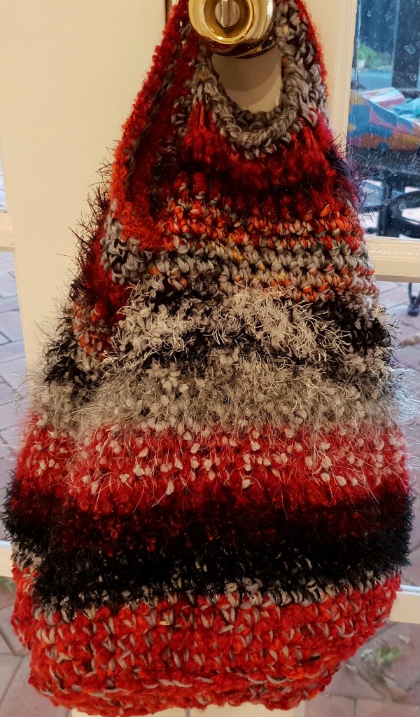 This was one of the first. A large bag that actually informed the colour scheme for a refurbished family room! All double crochet (US single crochet) with yarns combined when necessary to maintain the weight As a switch from chunky to fine, I plied some very fine hand-dyed weft threads bought in weaving villages in West Timor with commercial embroidery threads to make a pouch for the mobile phone and the credit card when walking….the cord is a Romanian lace braid.This phone bag was sheer indulgence in using colour. I haven’t ever used it because it’s so lairy.! Again, the cord is a Romanian lace braidI strengthened the base of this larger bag by cutting thick cardboard from a box of wine and covering it with plastic wrap so it wouldn’t absorb water if any was around. Then I encased the base in black fabric and inserted it into the bottom of the bag. The bag handles are lovely. The consist of a spiral crocheted cord with a flange on each end. This makes it easy to sew the handle neatly onto the bag. Instructions? See this youtube video: youtube.com/watch?v=7dKQ-gP2U6A&t=31sThe bottom of the bag above.Detail of the bag above.A cute little bag made for a Secret Santa in one of my textile groups.There is REALLY thick yarn in this one. Spot the hair of my Rag Doll cat!A bag trio. The one on the right looks very sad. It once had a purpose which was to hold lots of yarn but since I put more cupboards in it hasn’t had a real job.Sometimes bags become vessels! How? When the one in the first image on this post is stuffed! Quite sculptural.
