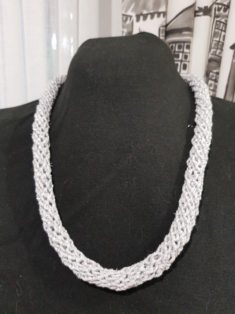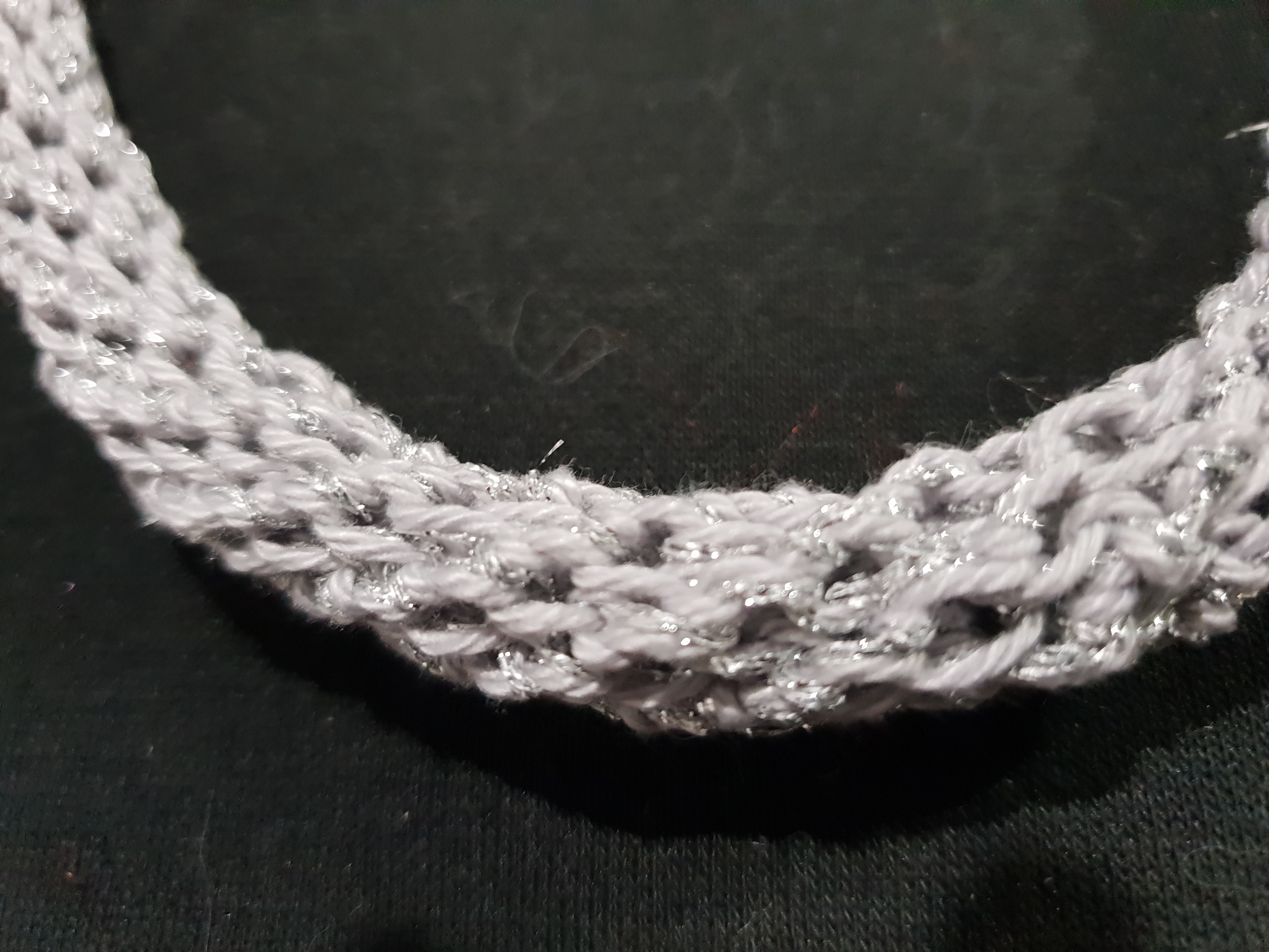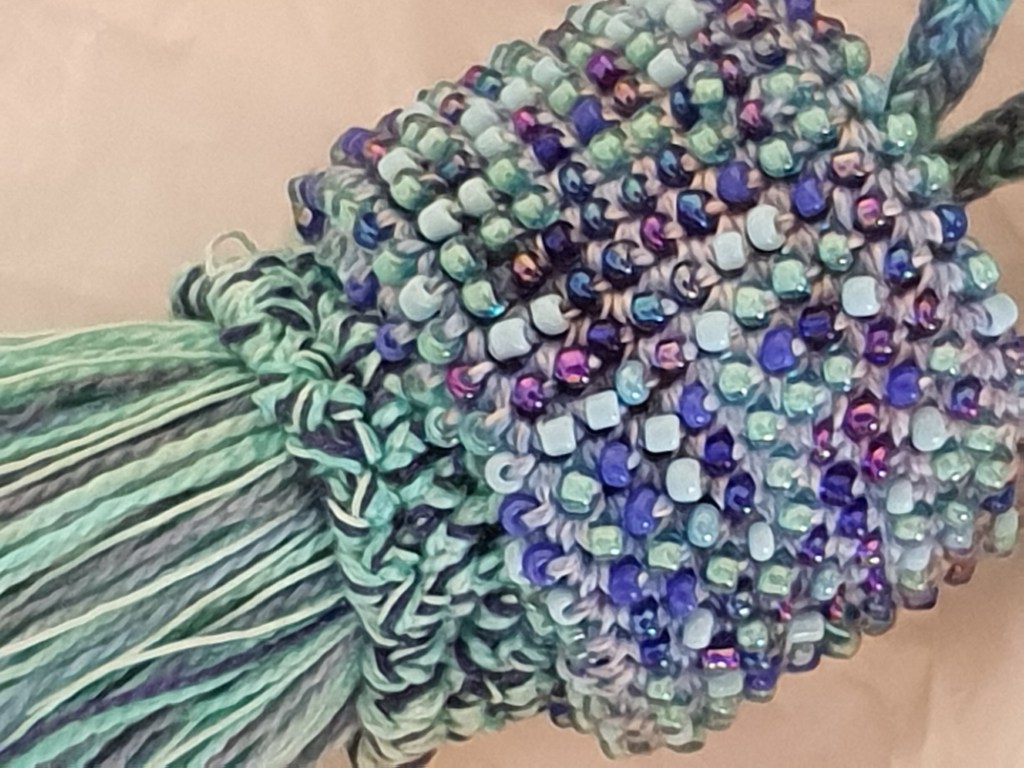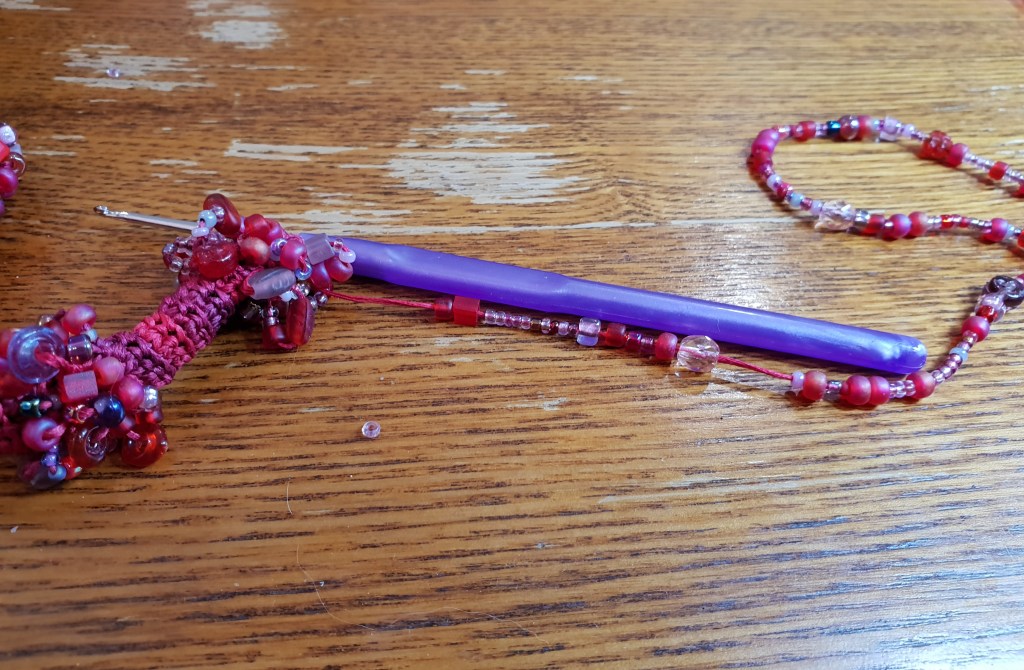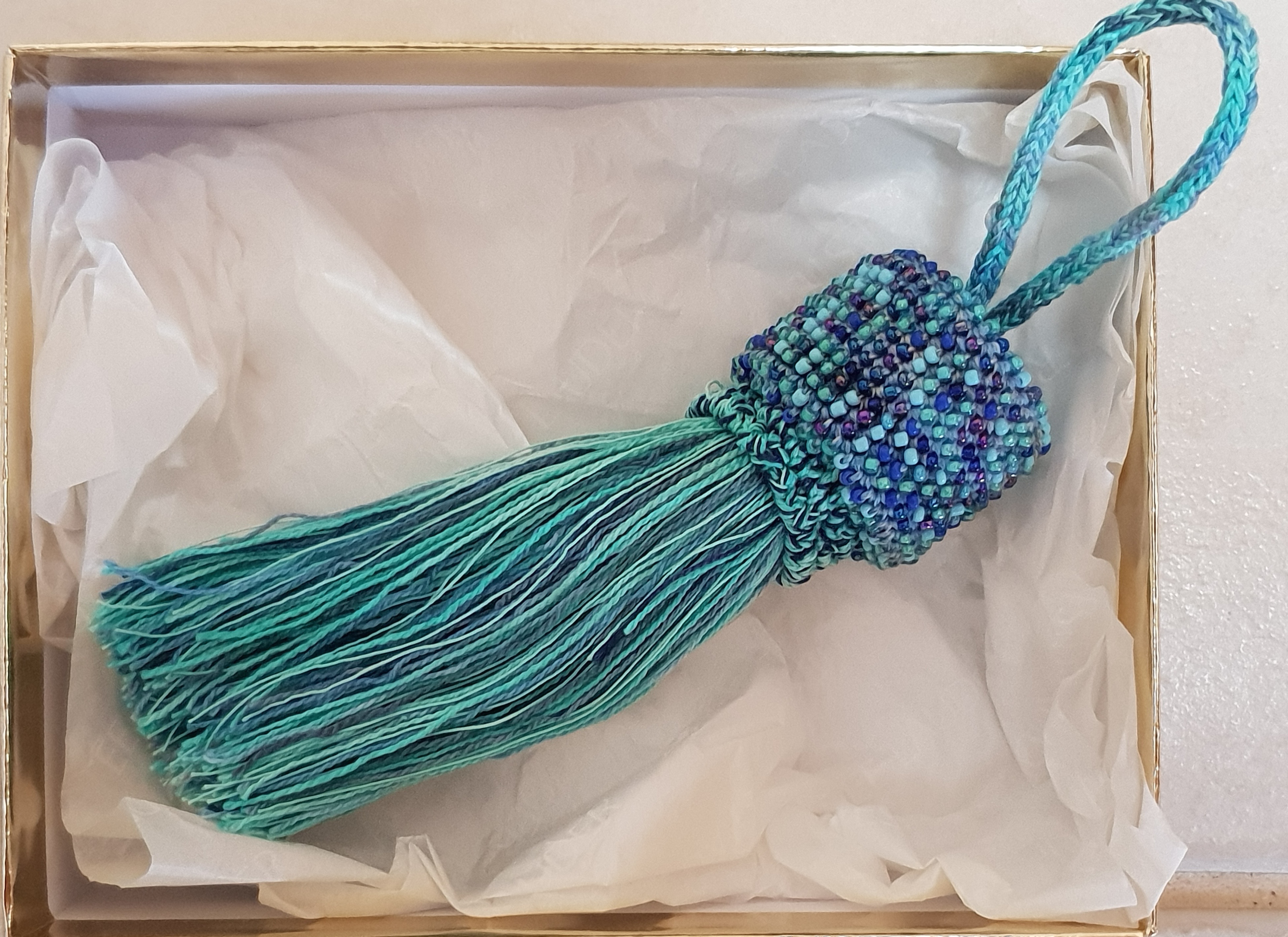 It’s constructed using a variegated Perle 8 thread crocheted with beads into a tube then inserted into a white plastic cylinder that had previously had another thread wrapped around it. The skirt is simply made from the same thread and the hanger is a knitted i-cord.