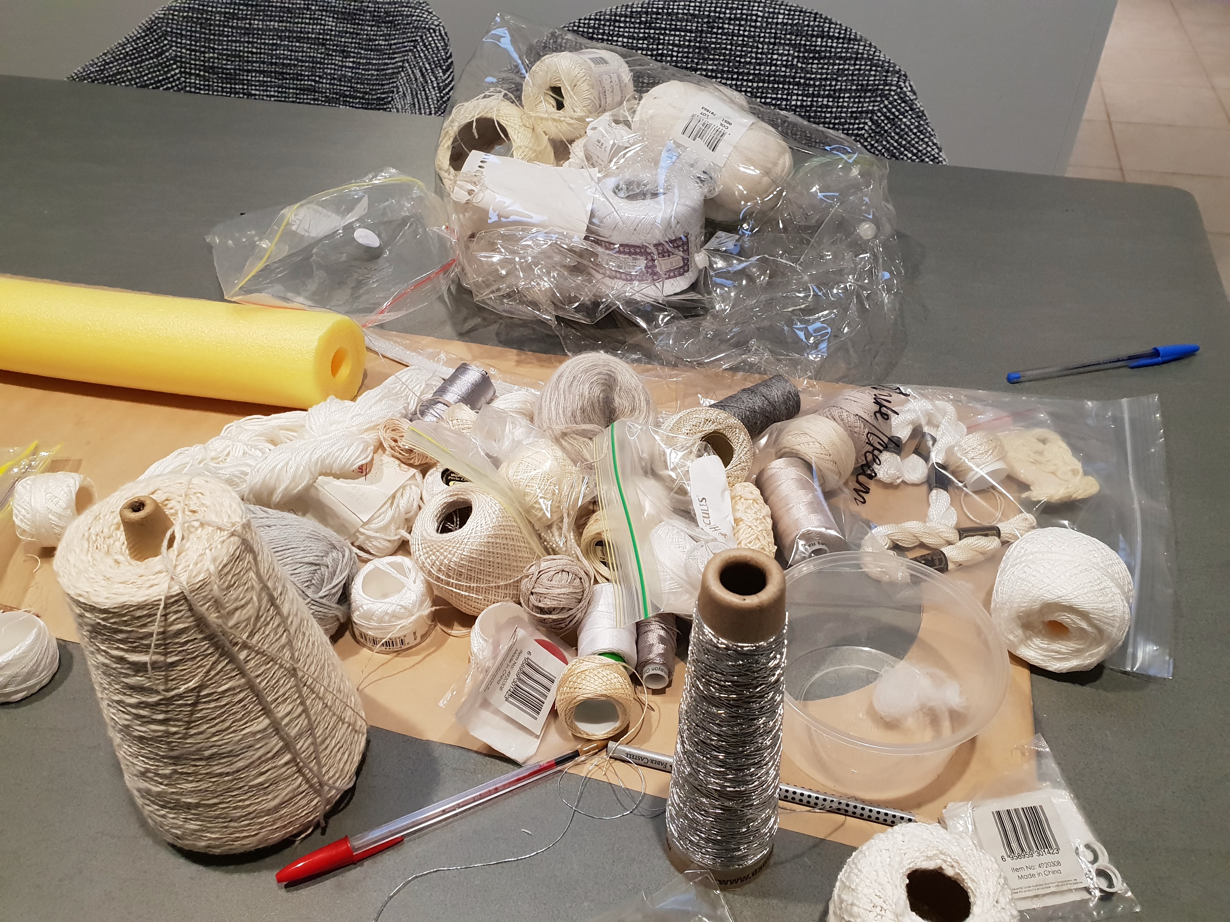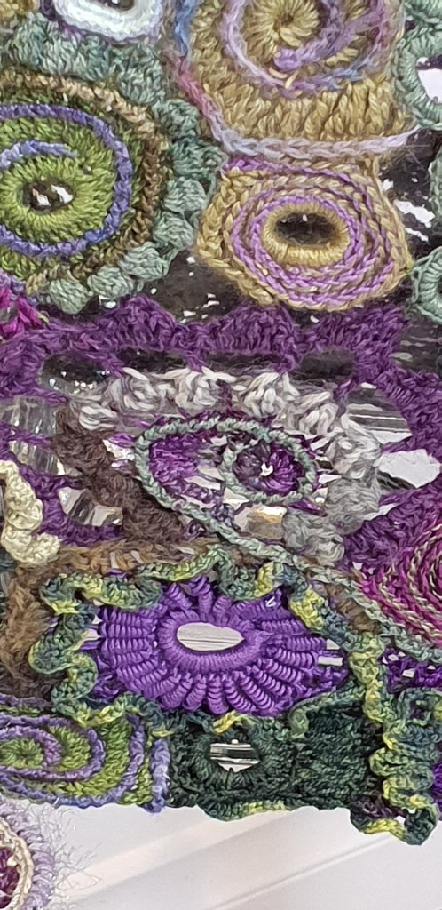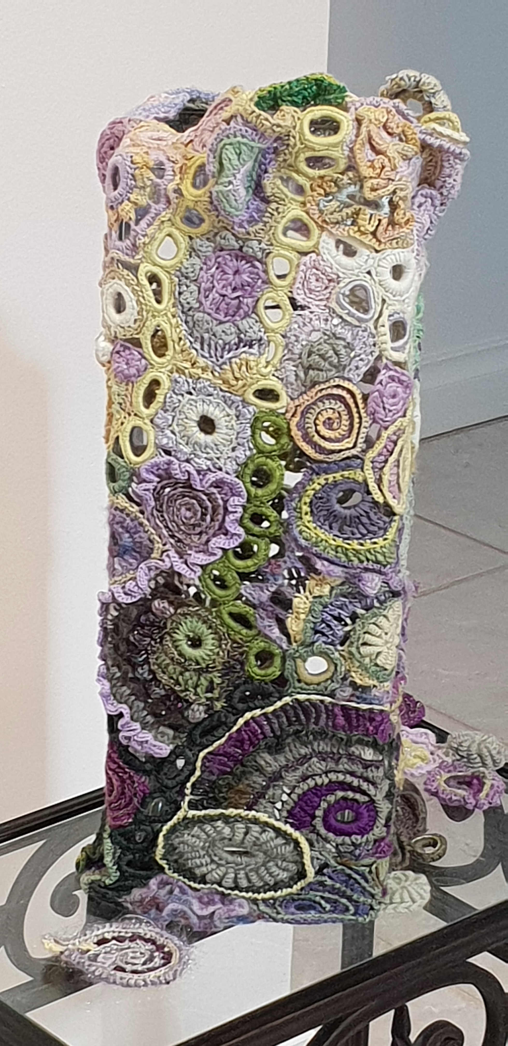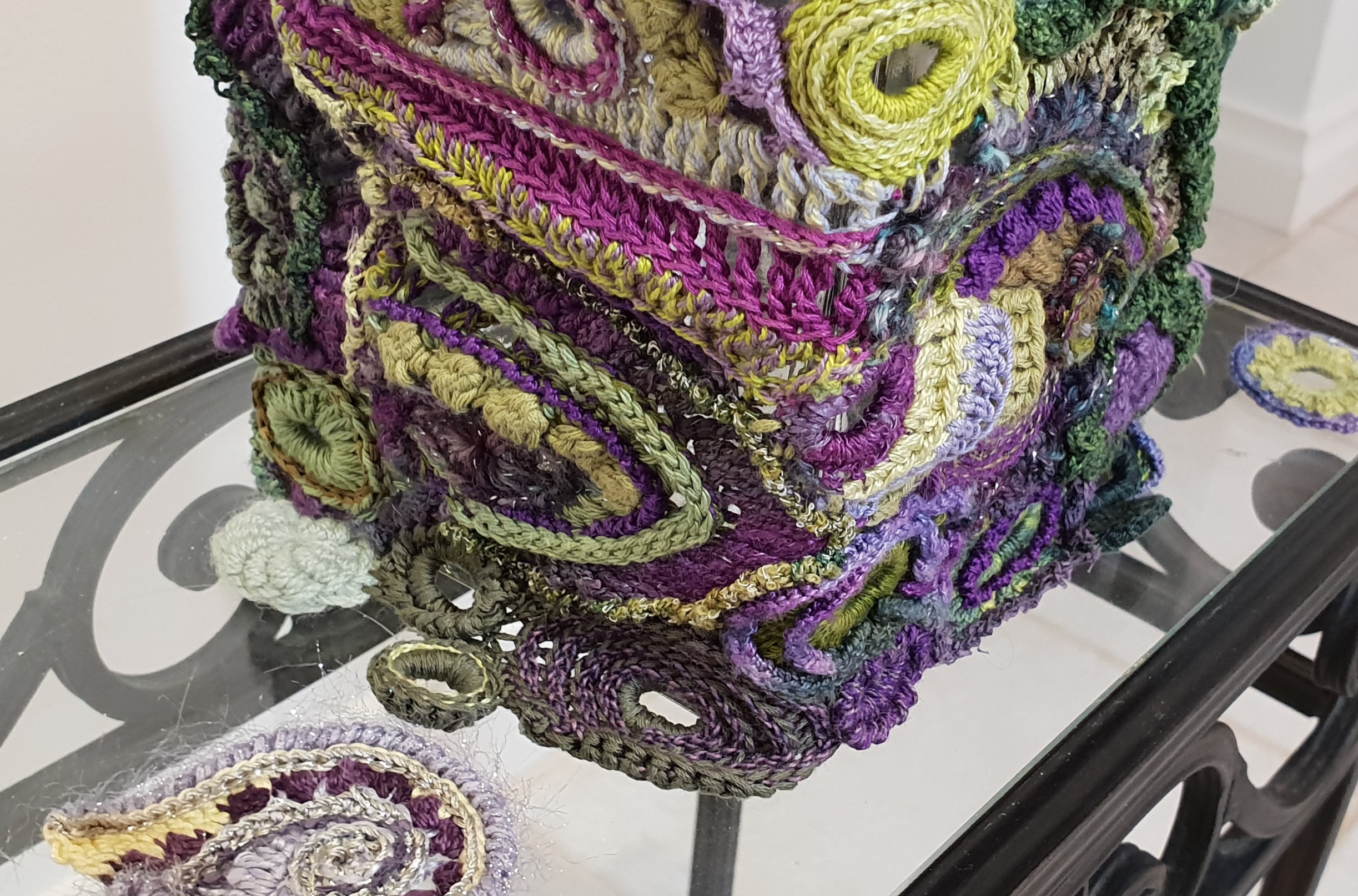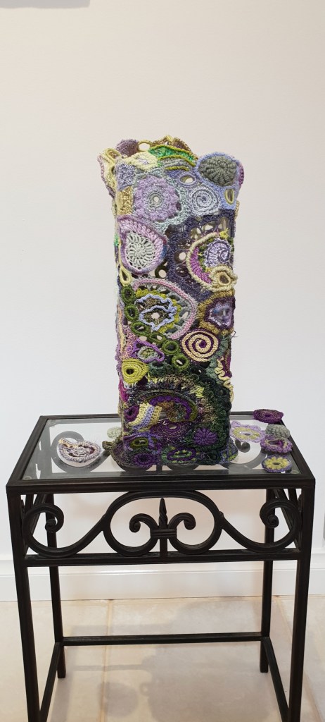I began with an ambitious design. A 3D twisted wire armature holding crochet and knitted and knotted “fabric” in shape but allowing light to cast shadows through the “fabric”. Design to be bold from a distance; more detailed from about a metre out; and micro-detailed close-up.