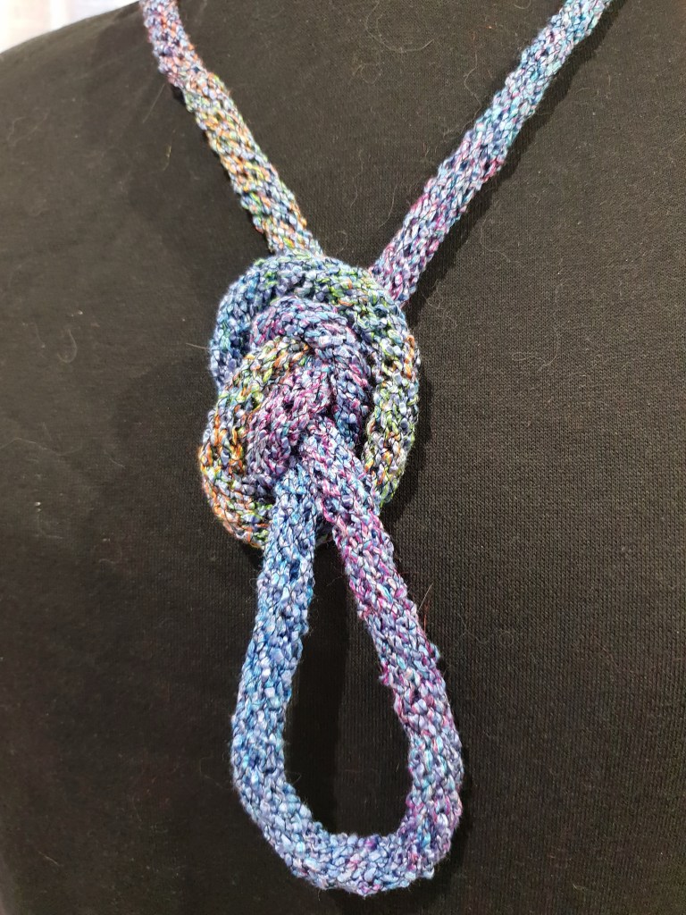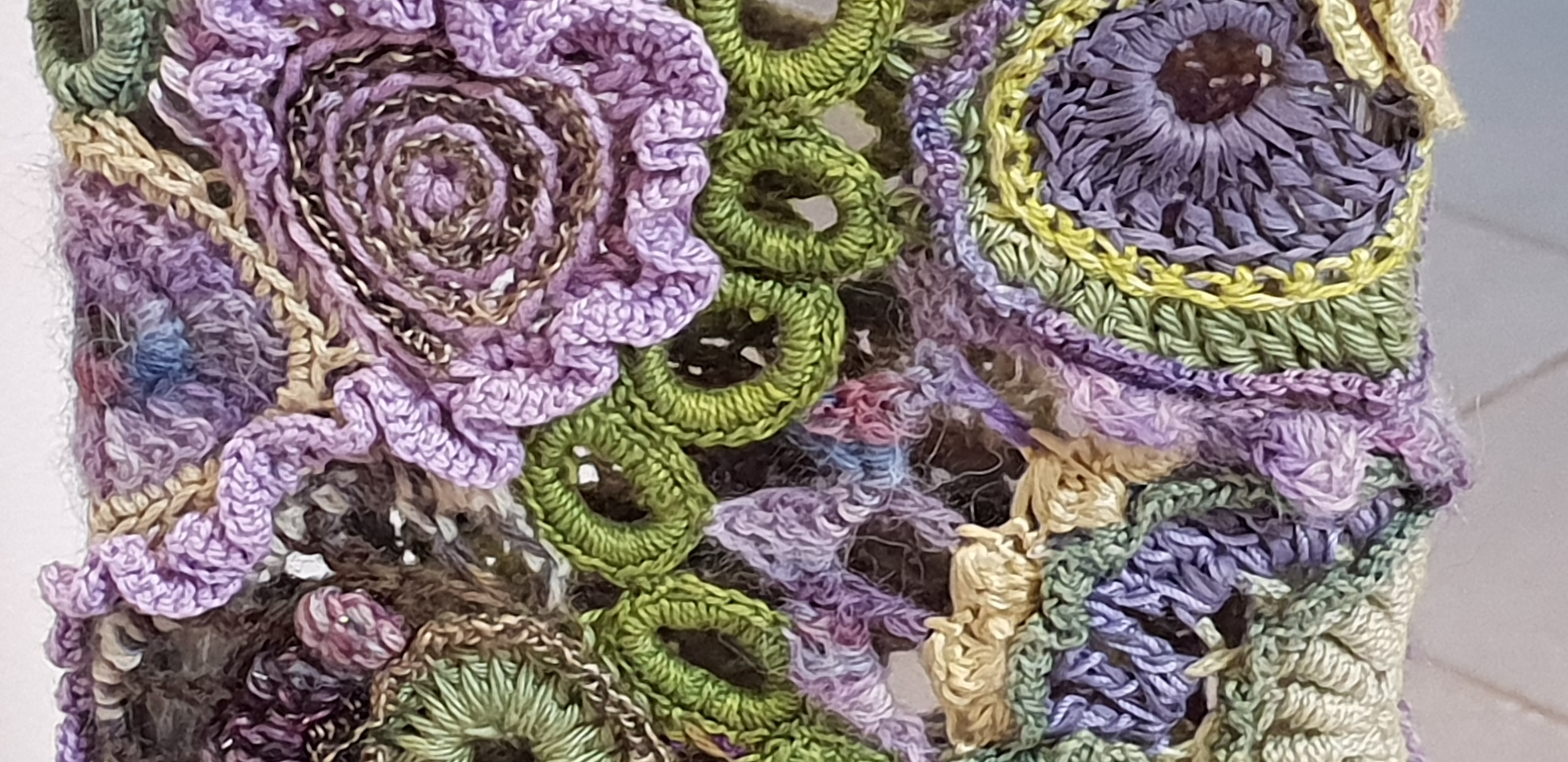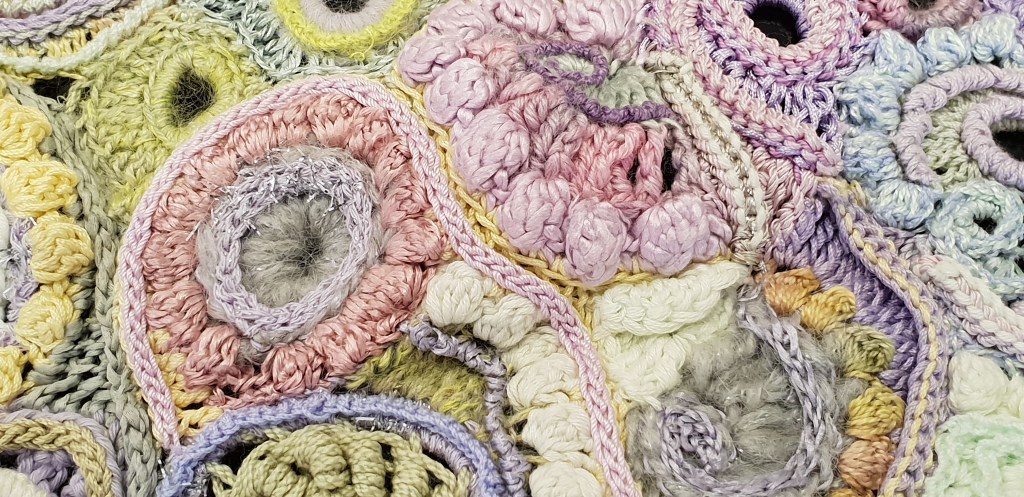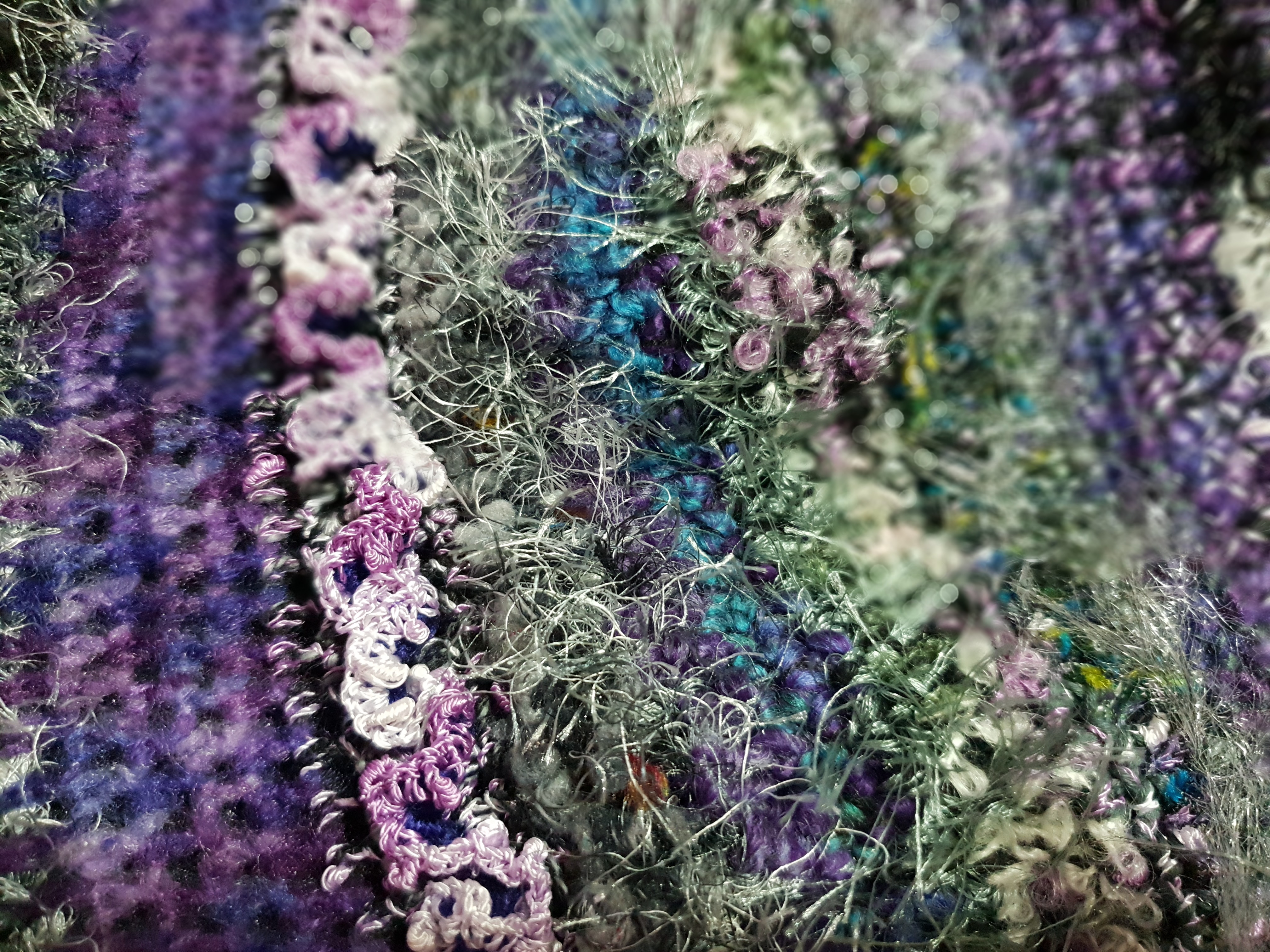 I began with an ambitious design. A 3D twisted wire armature holding crochet and knitted and knotted “fabric” in shape but allowing light to cast shadows through the “fabric”. Design to be bold from a distance; more detailed from about a metre out; and micro-detailed close-up.