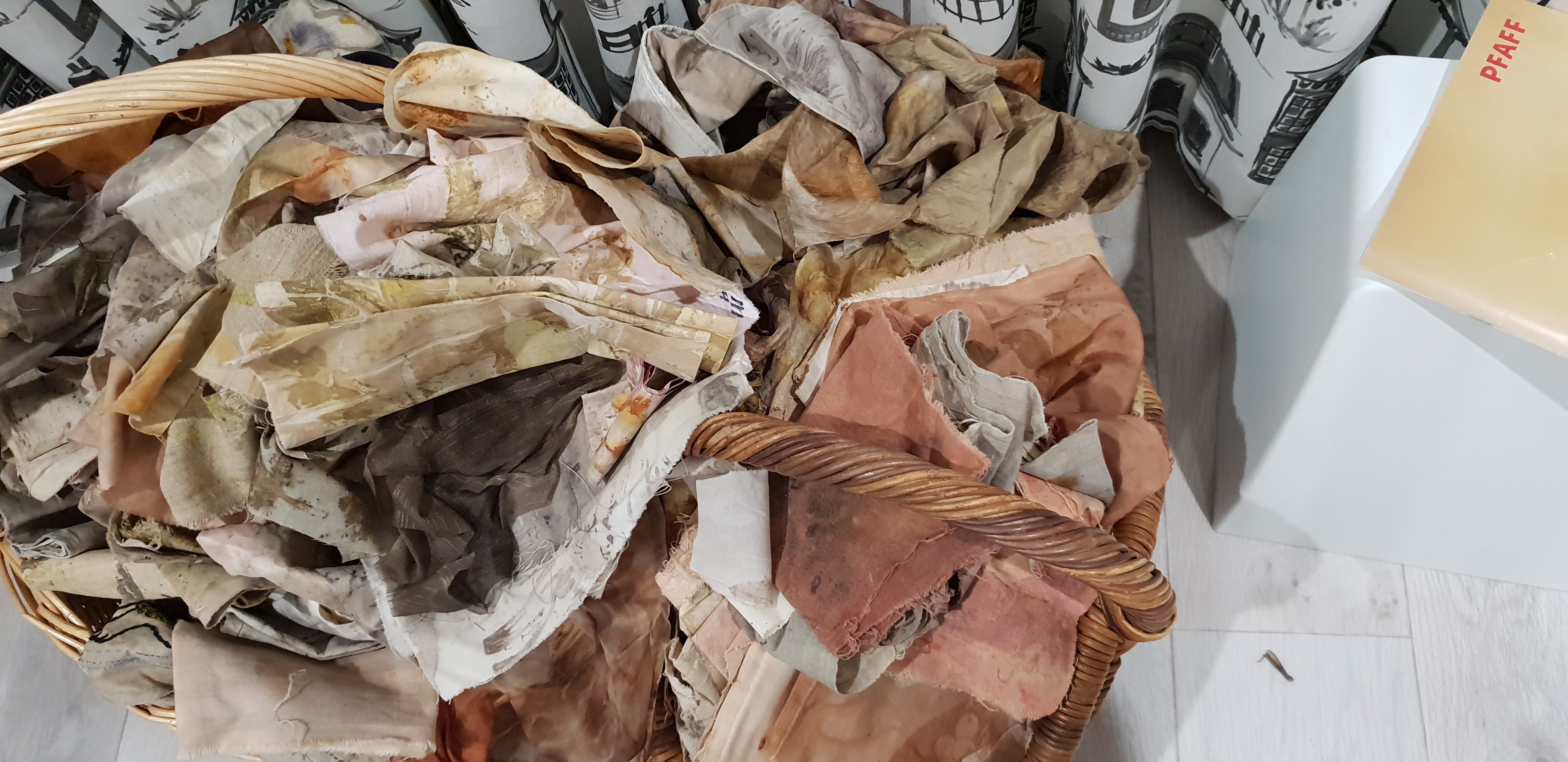 I have several baskets of recycled plant-printed cotton and silk fabrics.