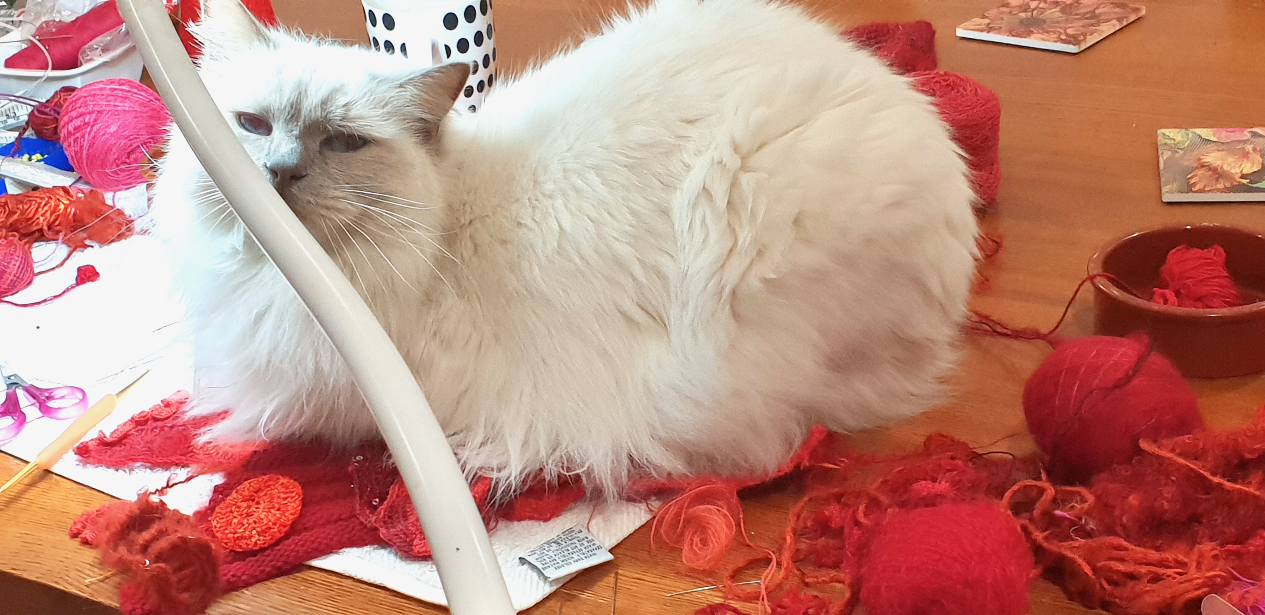 And now for some colour: the beginnings of the red pieceRag-doll Cat Samson liked to sit on the red piece in progress