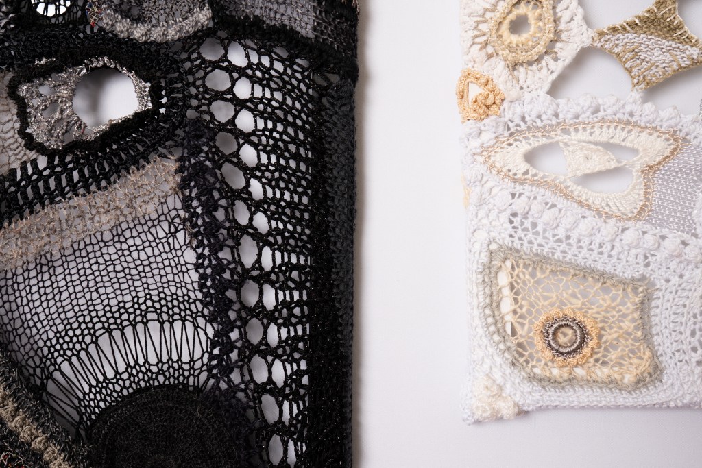 The work includes found objects such as metal and rubber washers; beads; stainless steel, iron ad plastic wires; buttons; and bangles. They support and shape both natural fibres (alpaca, cotton, mohair, possum, silk and wool) and acrylic, lurex, nylon and polyamide yarns.