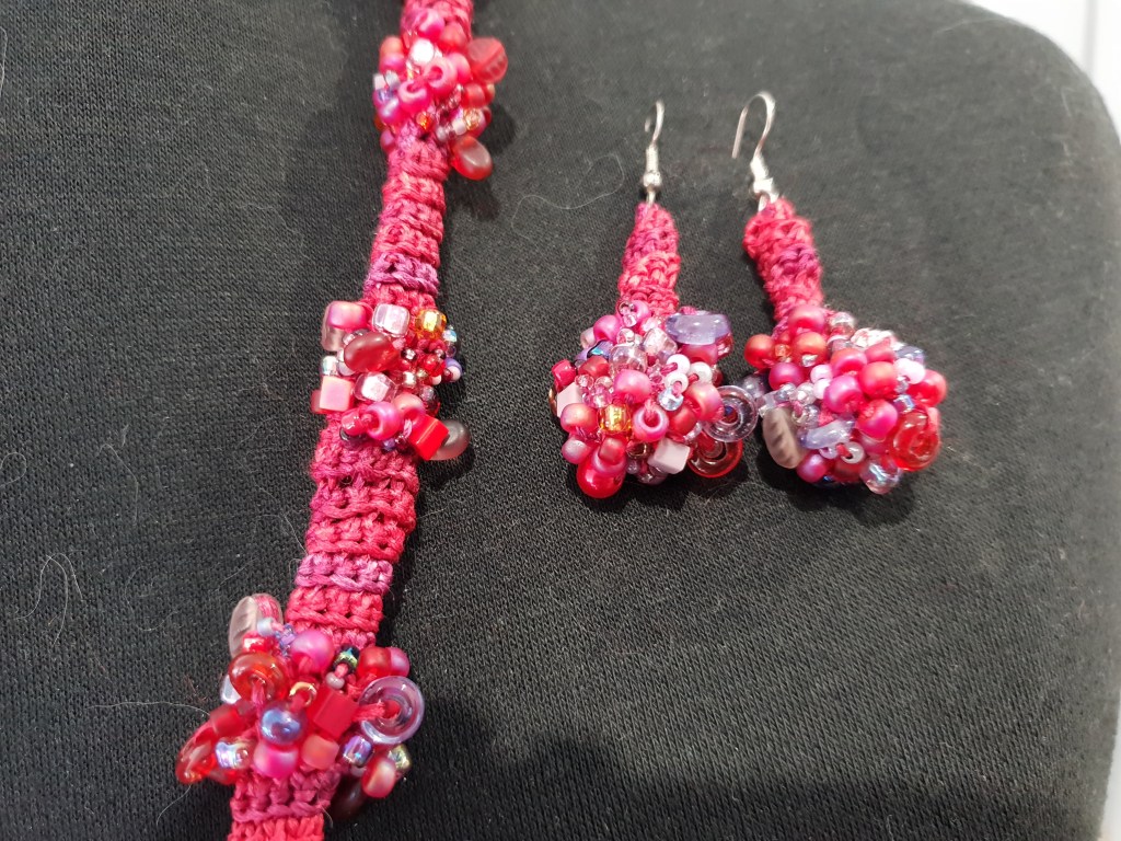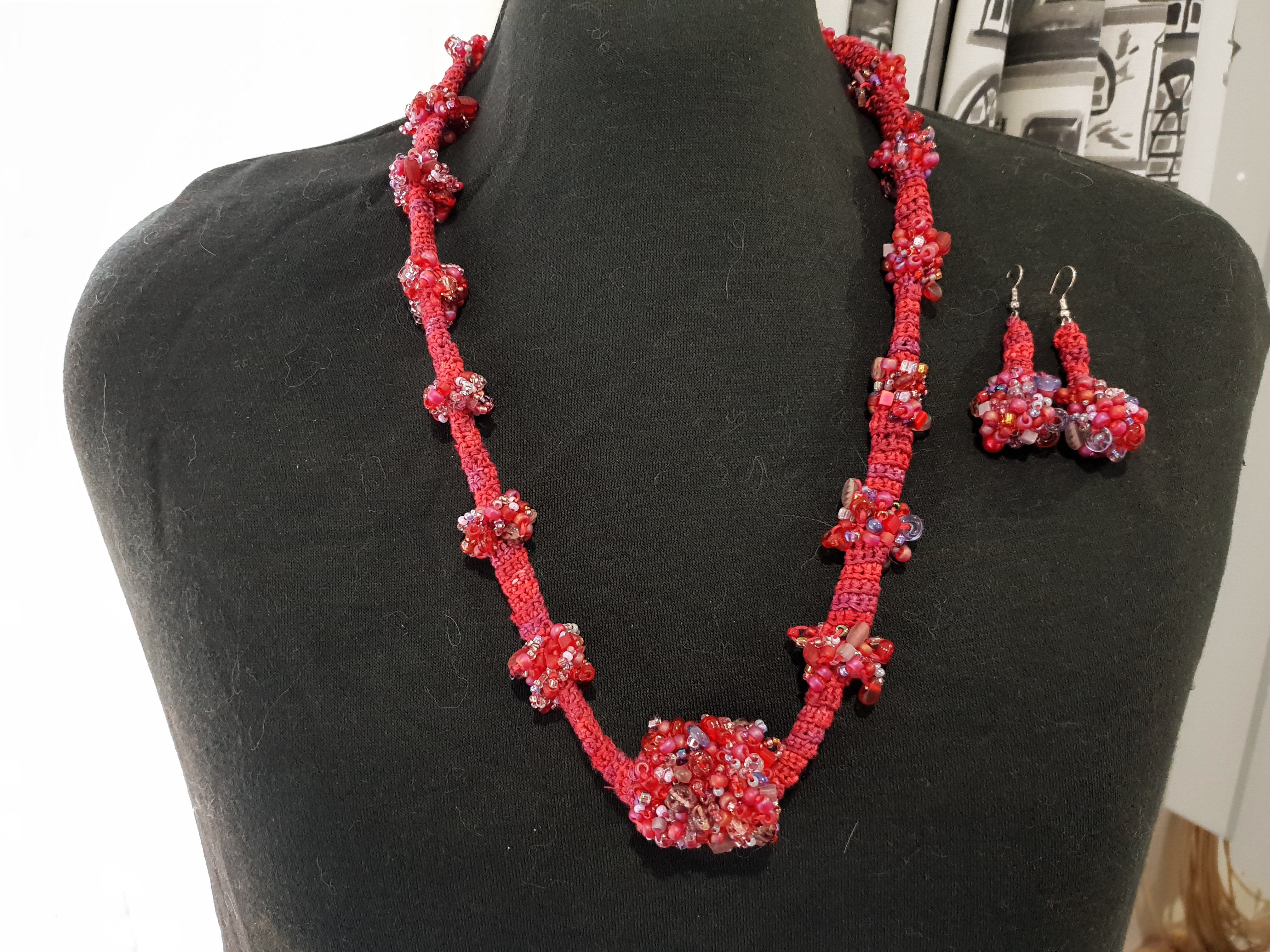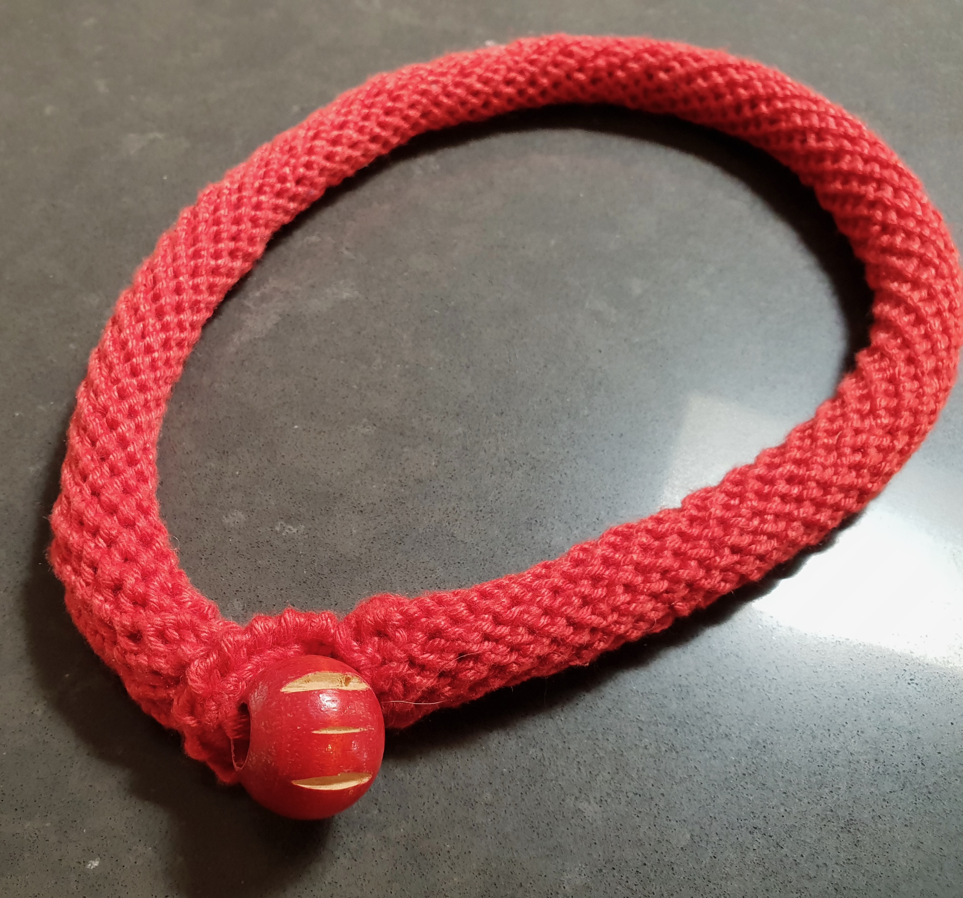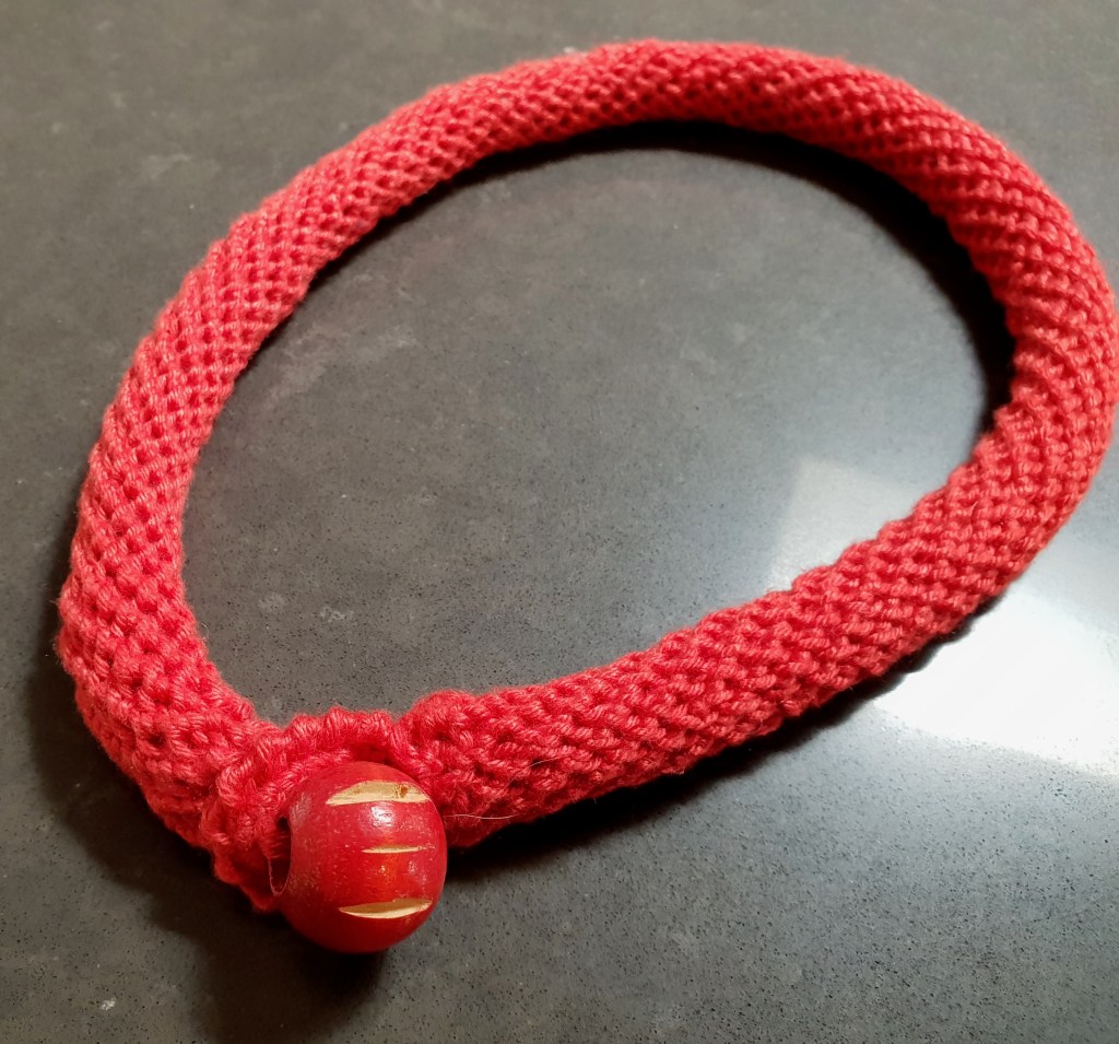 Note: Sam is not pink. The colouring is from red food colour which is very easy to do on protein fibre. The beads are recycled from an old necklace.