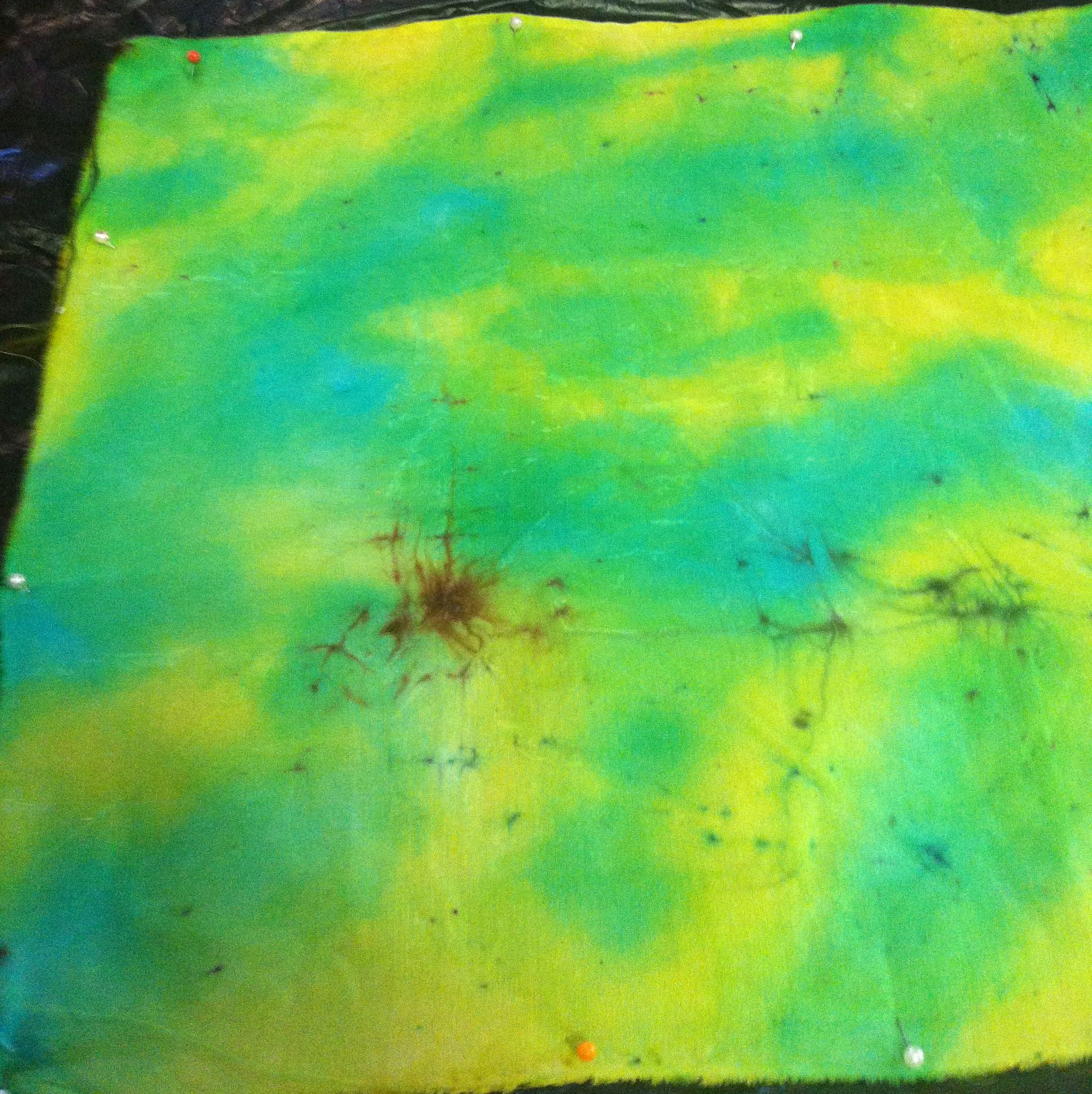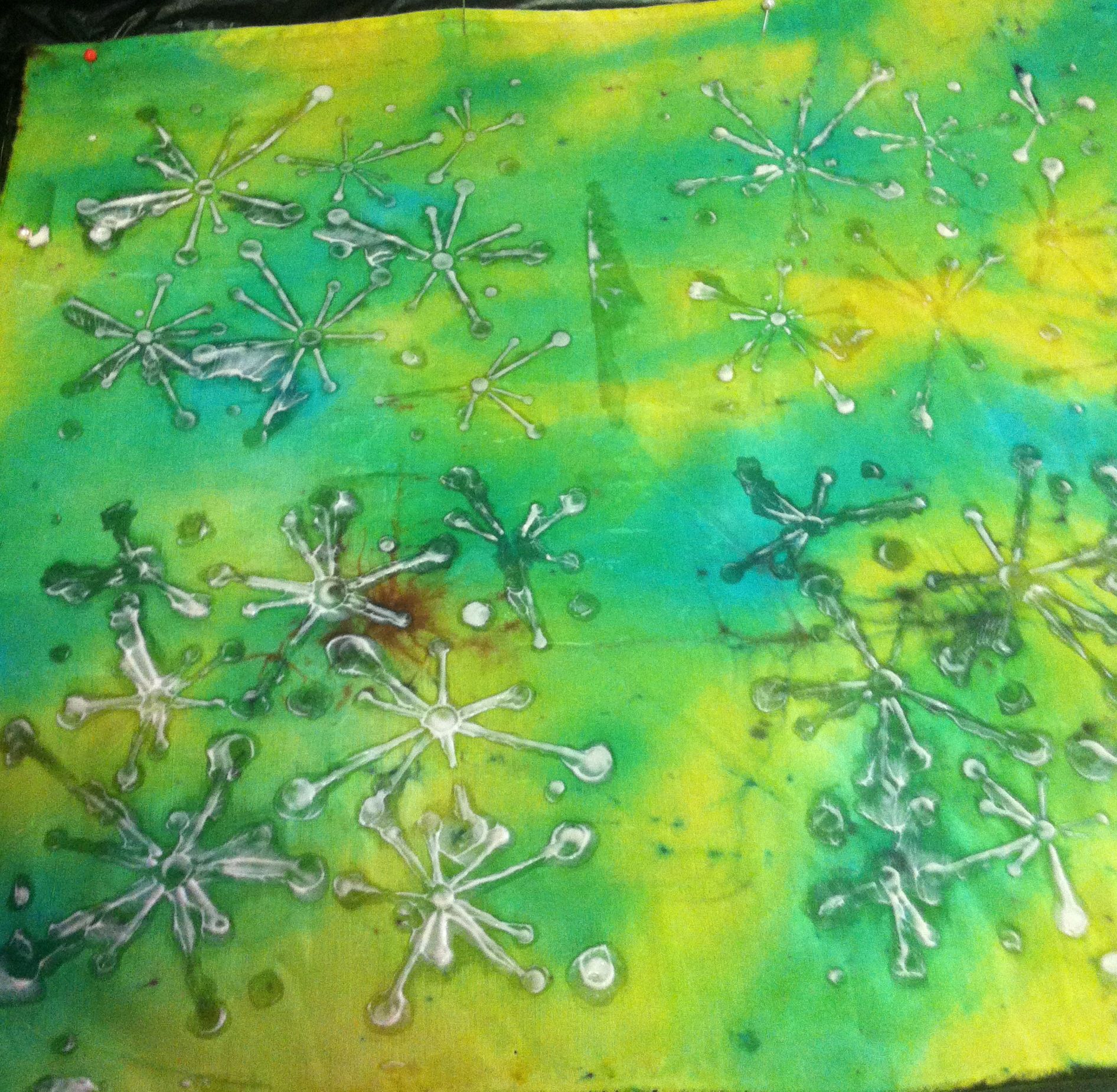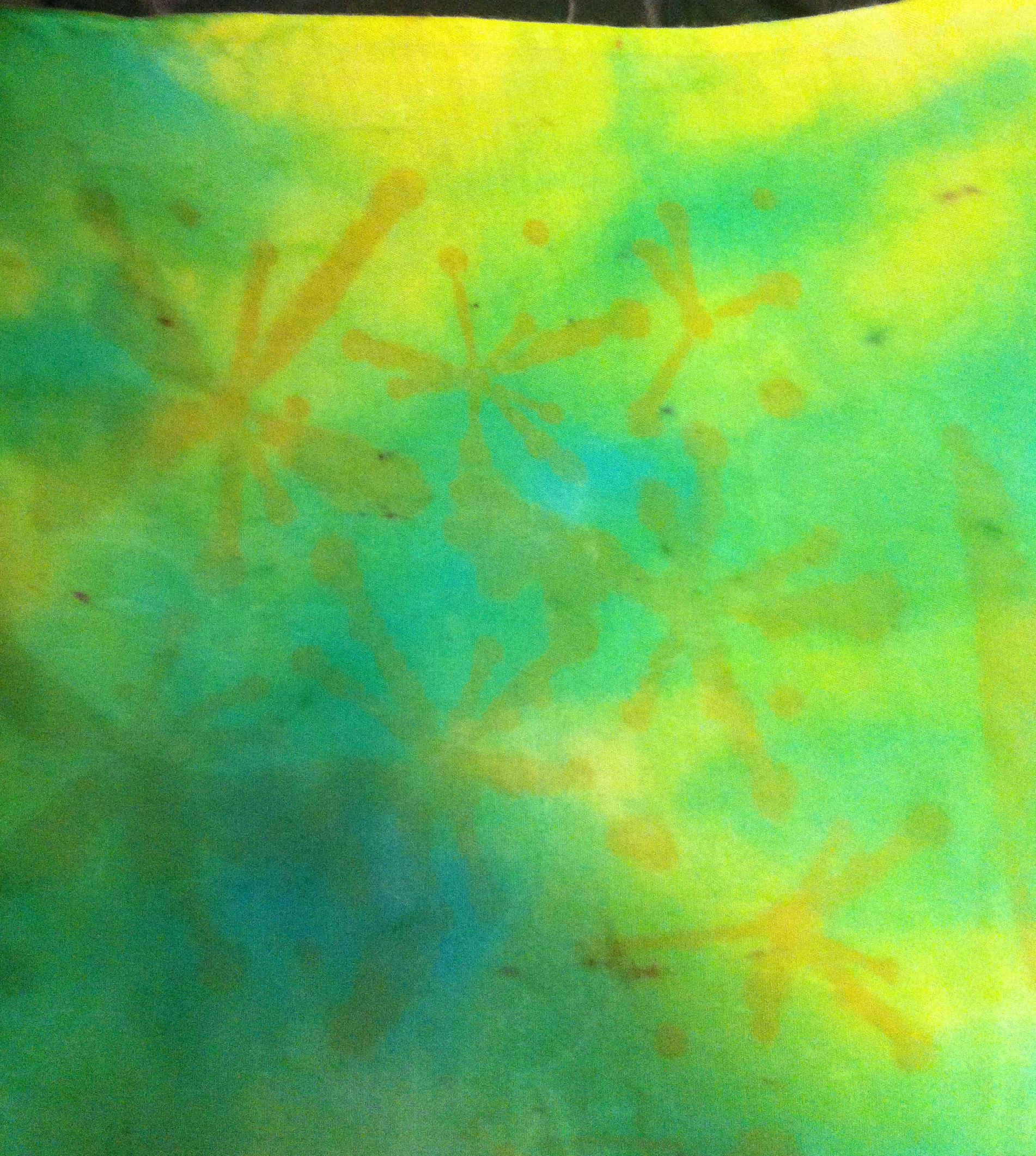 I pinned out a piece of hand-dyed silk fabric and applied the cream to each quadrant of it at different times through a stencil. The cream was left in the left upper quadrant for one hour; in the right upper quadrant for 45 minutes; the left lower quadrant for 30 minutes; and the right lower quadrant for 15 minutes. The recommended exposure for skin is five minutes with a maximum time of ten minutes. I then washed the whole piece with soap and water. Interestingly, no grease marks. Just some pale pink stencil shapes. The Nair cream had behaved in a similar way to Decolourant Plus in that the colour of the fabric had been removed and replaced by the colour of the cream. No obvious stress to the fabric itself, however. No holes or weakening.