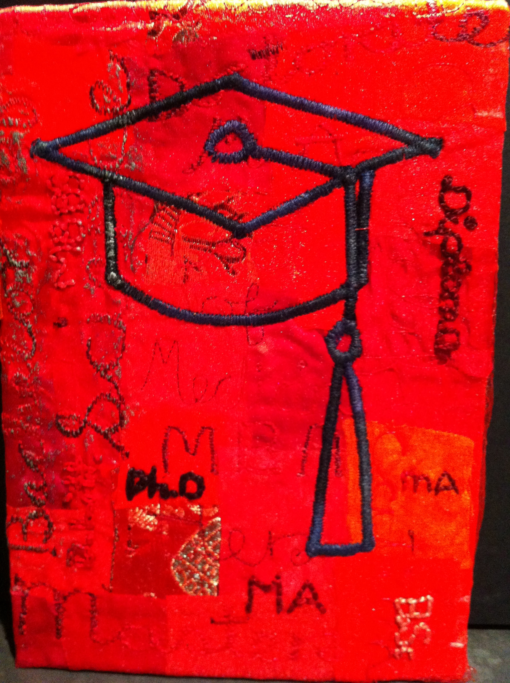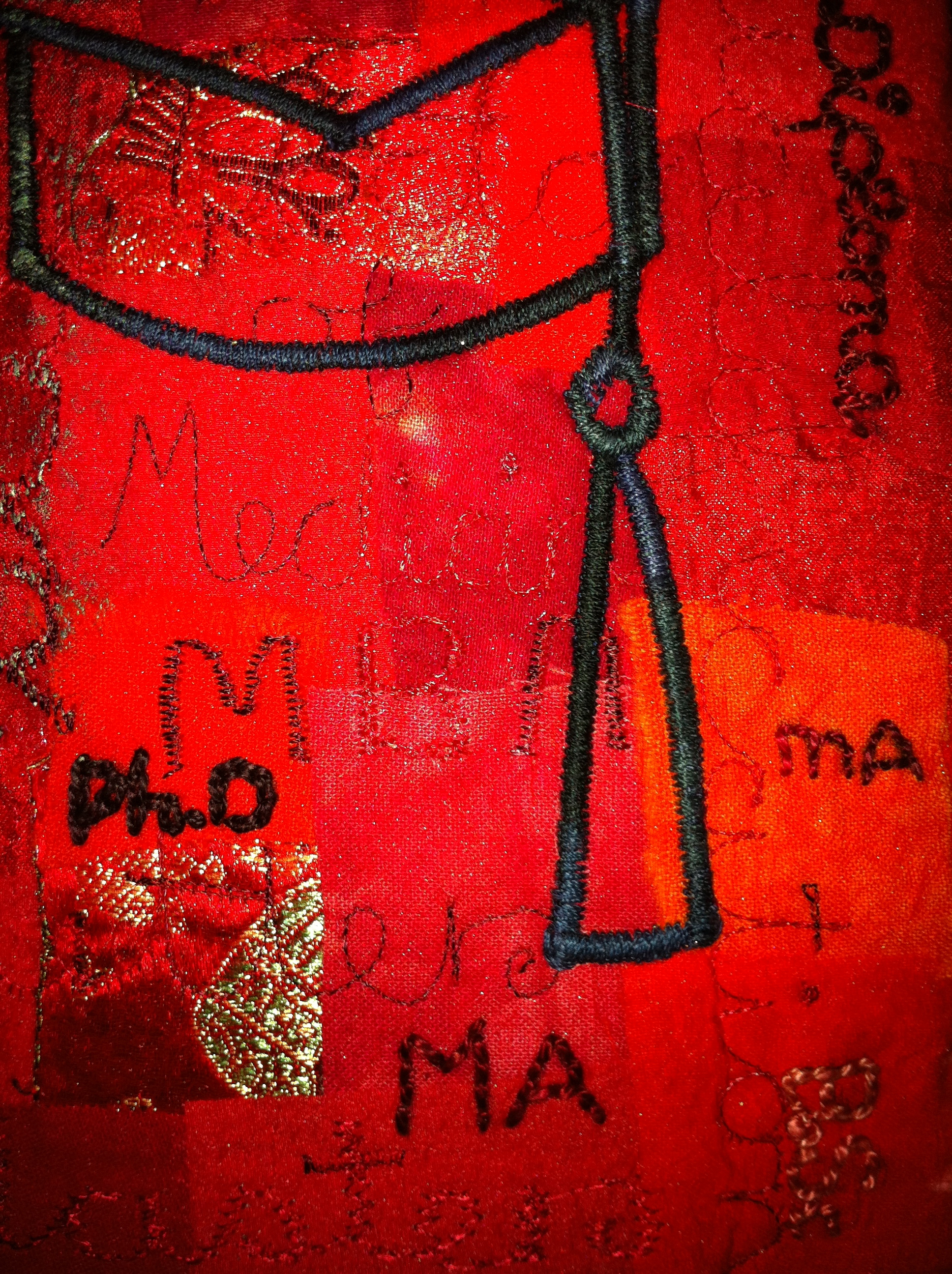 LetteRED has a background of small torn pieces of fabric overlaid with very fine red nylon gauze held down with free motion quilting using words associated with higher education – hence the LetteRED man. Also has hand embroidery and some “Treasure Gold in aquamarine to highlight. The mortar board derives from a non-copyright image on Google.