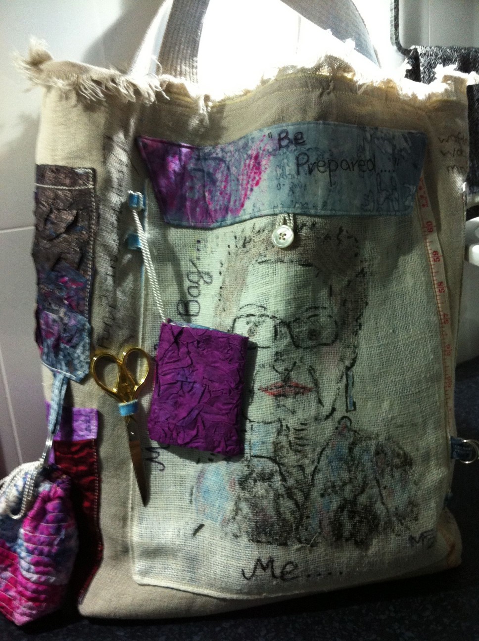 The end result is a bag with a vast interior for actual fabrics and interfacings (including soluble fabrics), paper etc, plus lots of pockets and bags in which to put notebooks, buttons, trims, bobbins, threads, crochet hooks, thimbles, measuring tapes, beads, stencils, ink bottles, crayons and pencils, etc.