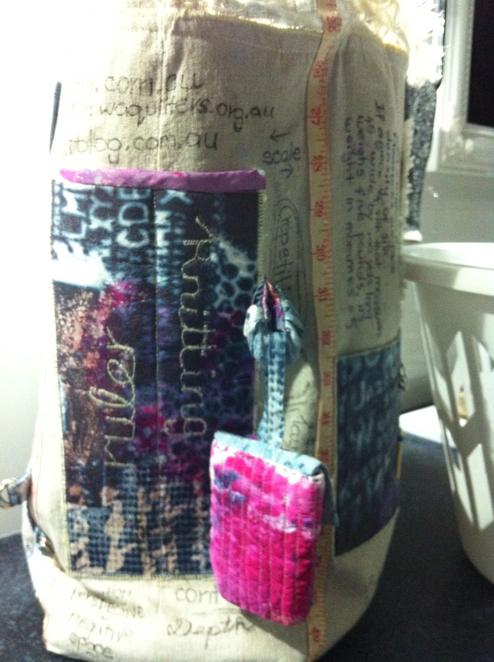 In my “bag-making ” mode for the May 2013 Perth Craft and Quilt Show bag display by WAFTA, I decided to try a design for a “project bag”. This would be large and I wanted to use all my scraps of canvas and silk that had been printed using deconstructed screen printing techniques. I also wanted to use various fabric manipulation techniques so that the bag would offer me a ready reference for these as I designed a new project.