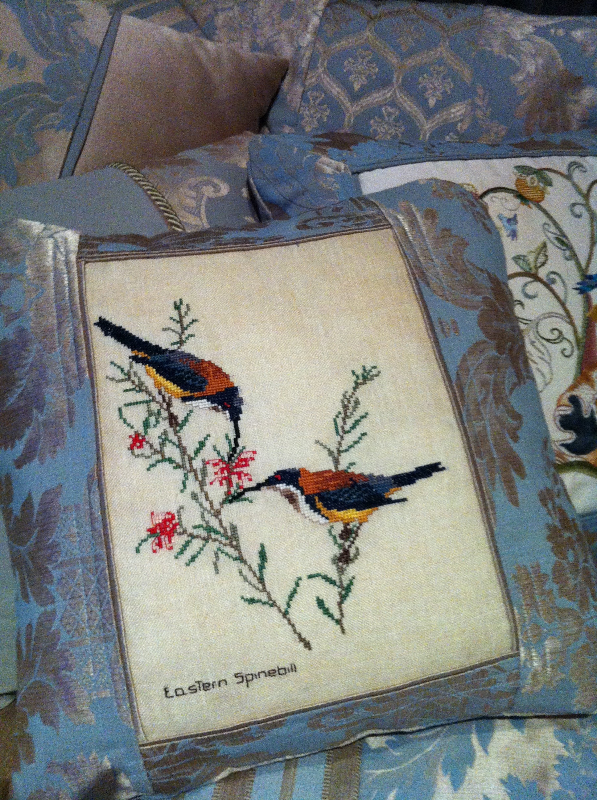 While I was on a roll, I took a framed embroidery by my mother apart. The embroidered birds on linen cried out for a new life.