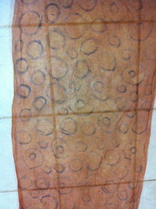 Back to the fabric. I wanted to paint some circles onto one (#1) of the pieces dyed with avocado pips. My thickened avocado skin dye looks too close in colour to the pip dyed fabric and, what’s more, it’s too thick. I (think) I solved both problems by stirring some old iron water (made from dissolving ferrous sulphate into water) into a quarter cup of the paste. The water is so old it’s gone orange.