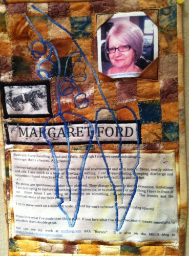 I’m a member of a Perth-based group called Designing Women. About twenty or so people passionate about textiles. We are having an exhibition later this year. So at our last meeting (last Saturday) we considered the idea of having artists’ profiles that were a bit more visible than the usual A4 page paper hidden in a ring bound folder. Why not have textile statements, we thought? Would the gallery owner allow that? What should be the format? Can we all just do what we want or should we have a standard format? The usual group exhibition questions.