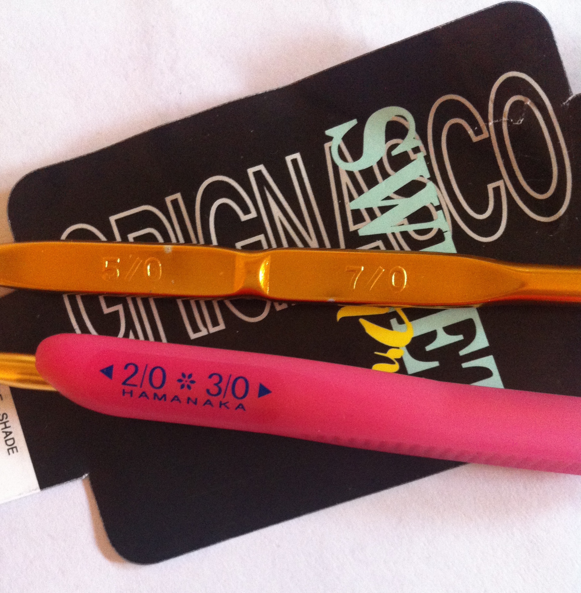 The floppy-looking bowl shape exiled to the plastic bag (the floppiness was no doubt why I’d not completed it before) looked as though it had been worked on a large hook. On experimentation it proved to have been a Tulip 7.0 or similar. I continued with this until I wanted to start tightening the band then switched for two rounds to the Tulip’s 5,0 end. After I’d worked the flaps I edged the whole thing with two rows of dc using the 3.0 end of another hook , finishing with a crab stitch edging in the 2.0 end. This last was hard as the yarn is not at all tightly spun and splits even with the theoretically “right” sized hook, let alone with a tiny one.
