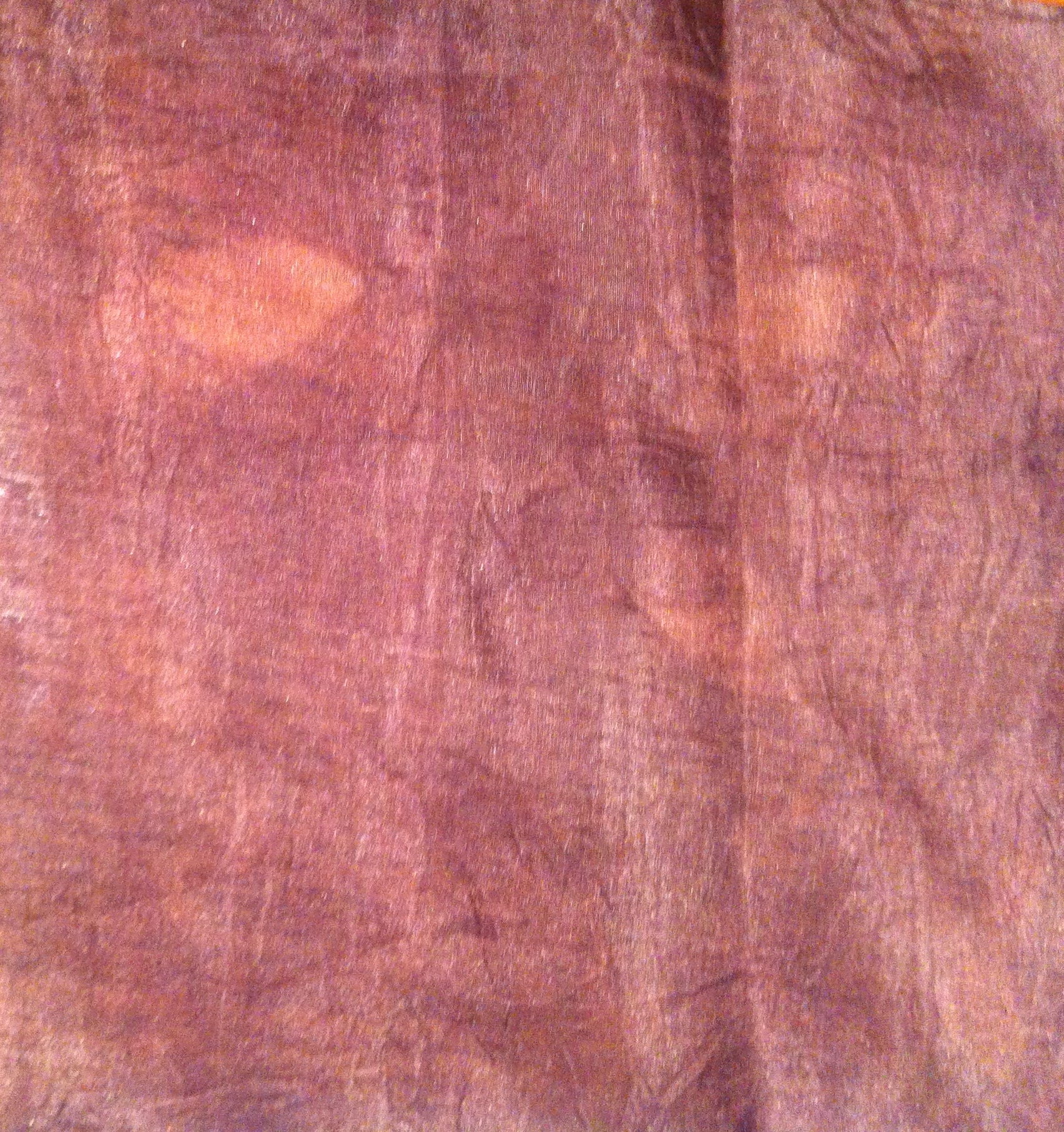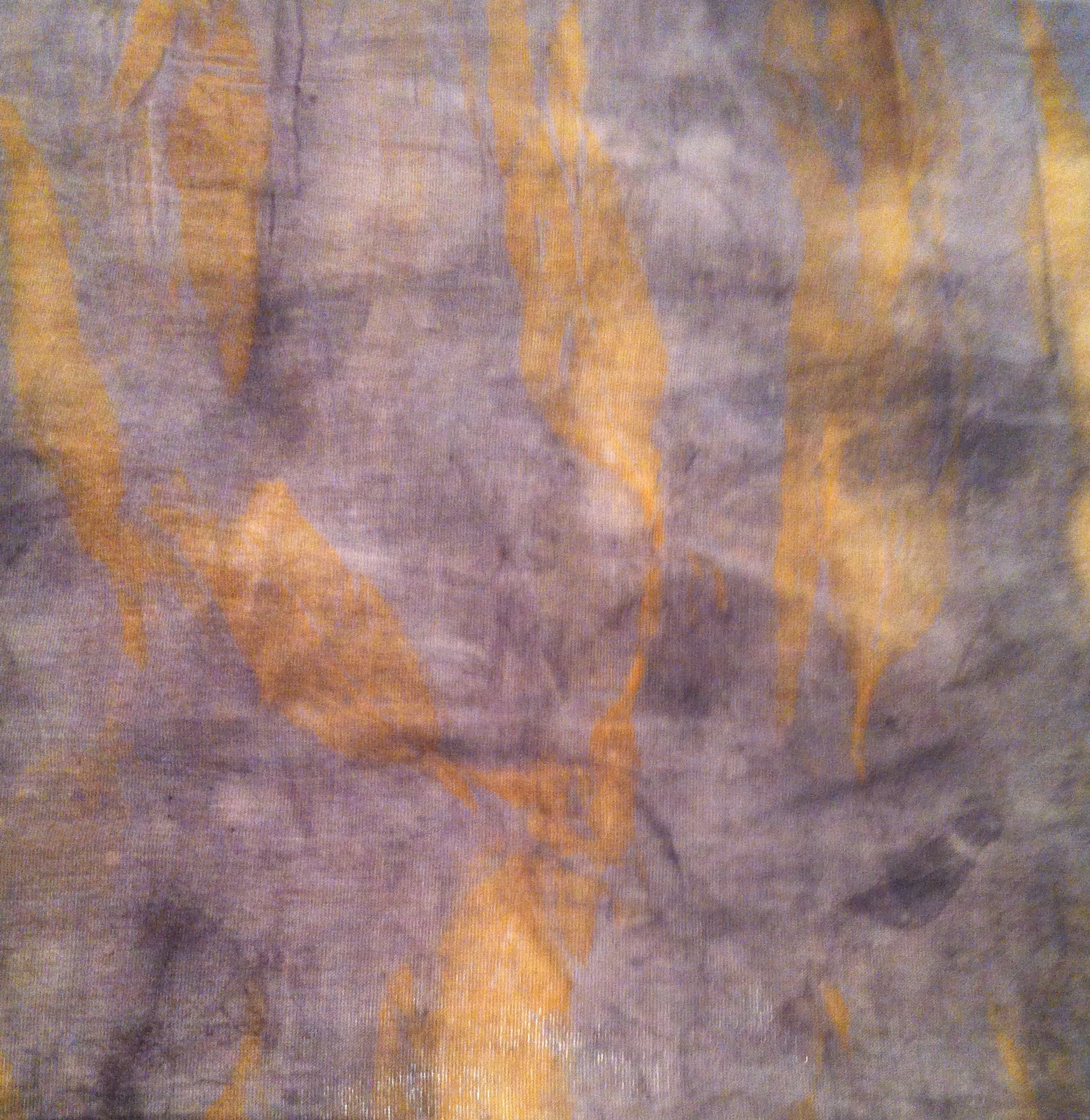 Relatively open weave of 80% cotton; 20% silk fabric, sprayed with iron water and bound with unknown species of eucalyptus leaves leaves.