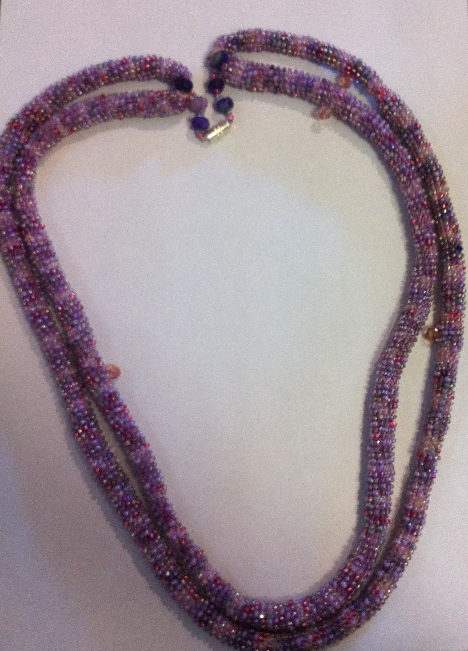 A long double-stranded necklace of two crocheted beaded tubes using variegated purple embroidery cotton and a mixture of mauve and purple beads.. closure is magnetic.