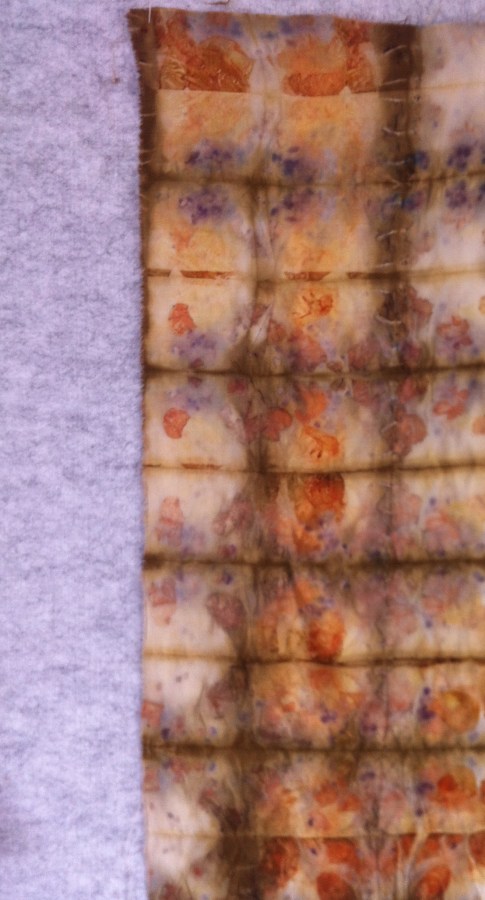 Silk, purple carrot, eucalyptus leaves and red and brown onion skins folded into a small bundle and clamped tightly between tiles before being simmered in a coreopsis bath for one hour.