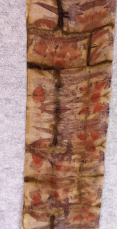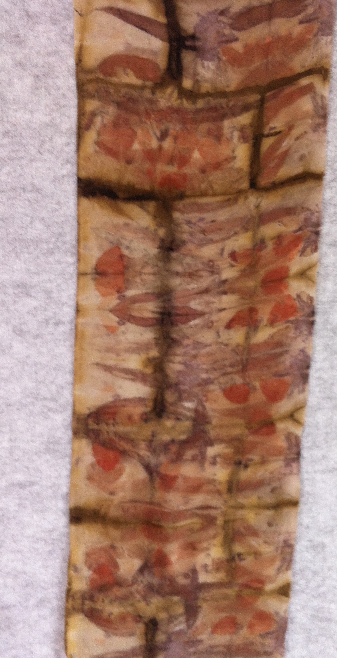 Silk, purple carrot and eucalyptus leaves folded and clamped between tiles and simmered in coreopsis bath for one hour.