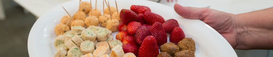 L-R: curry relish on toast; herbed, and sun dried tomato, pinwheels; strawberries; and cheese biscuits at WAFTA Altered States exhibition opening 15 September 2017. Image by Abigail Harman Photography, Perth.