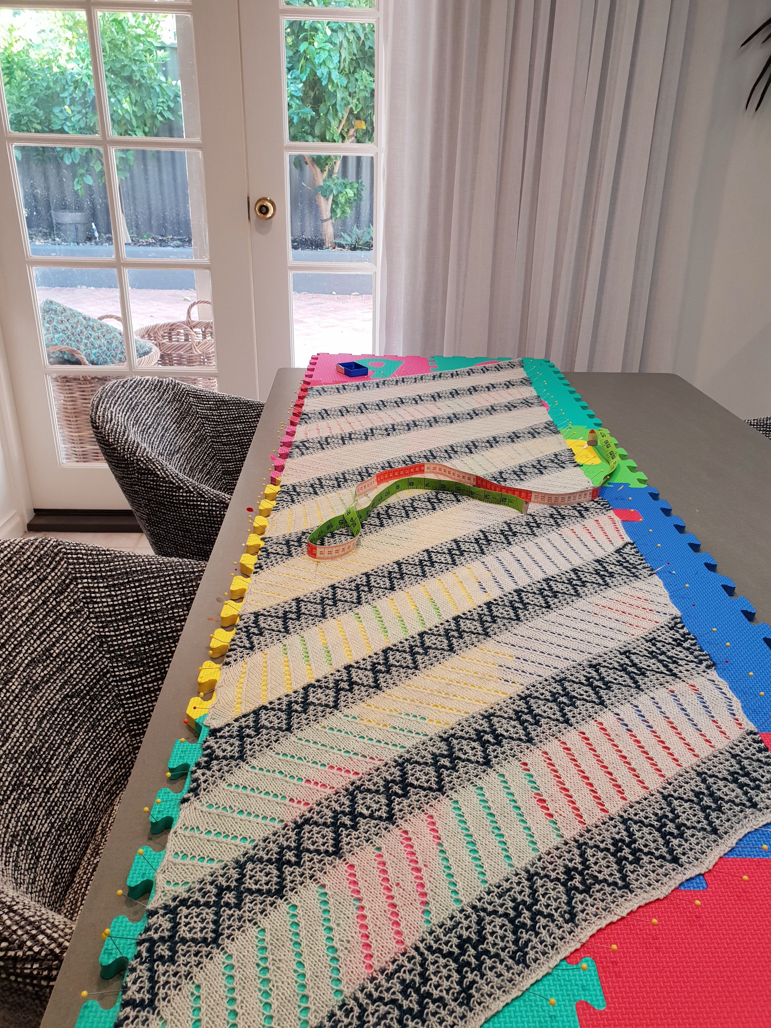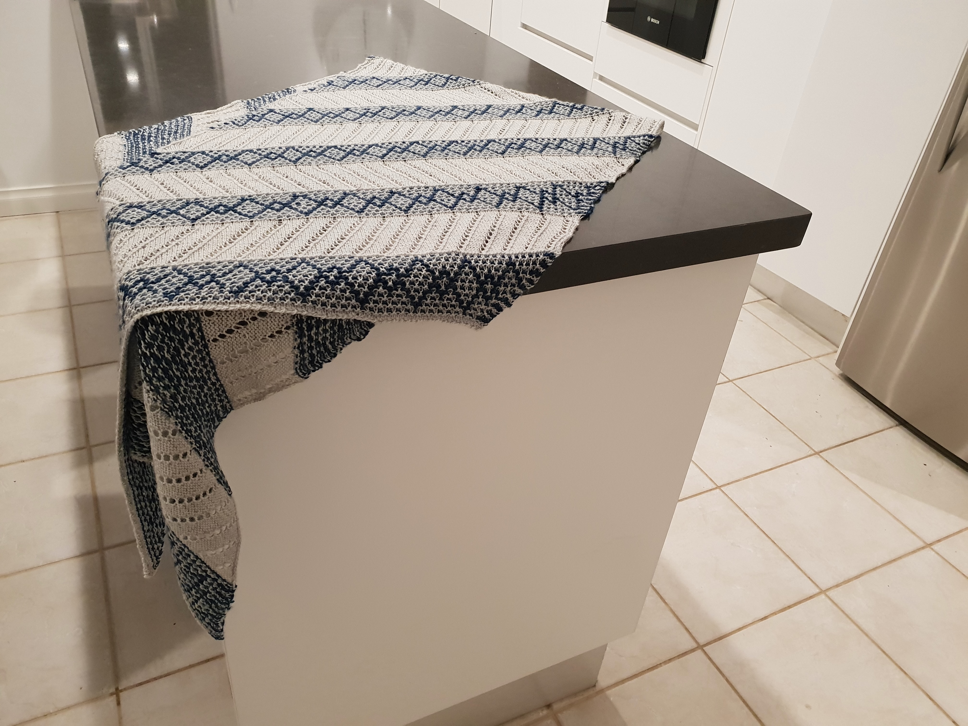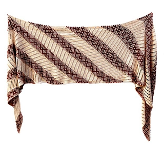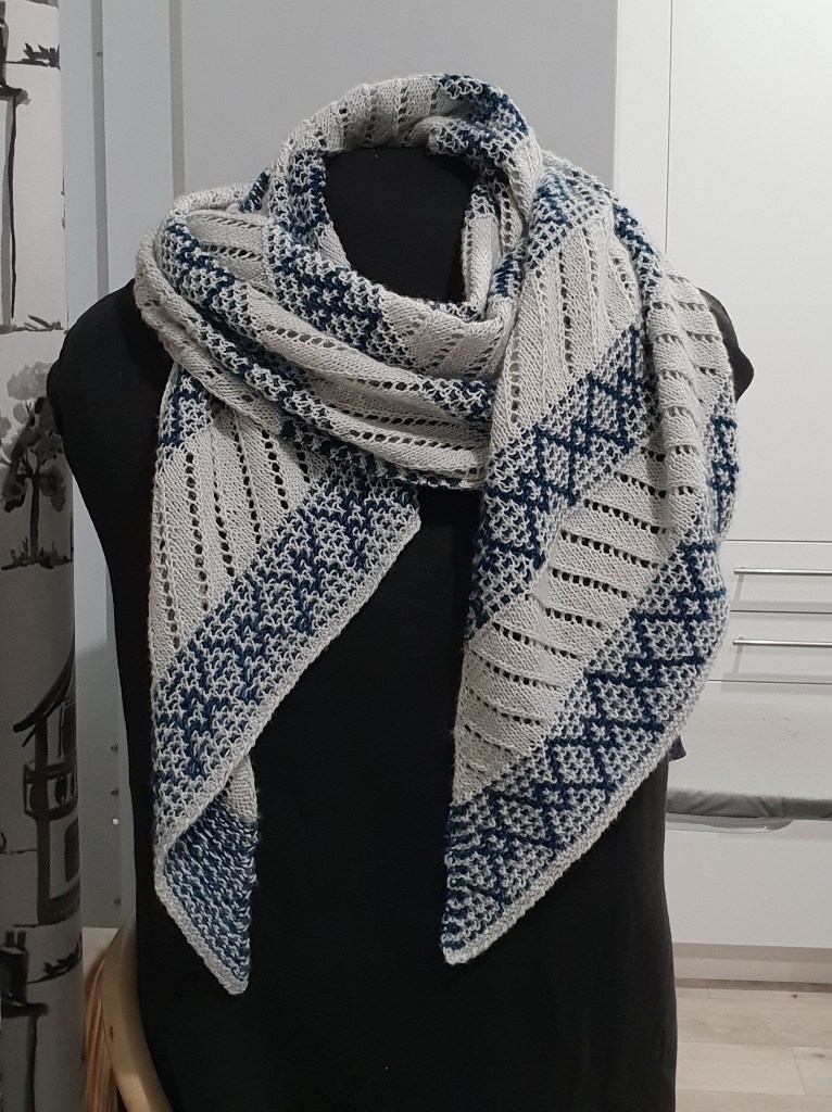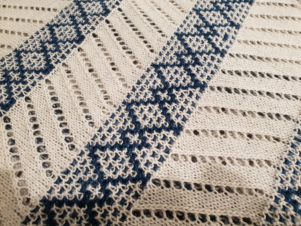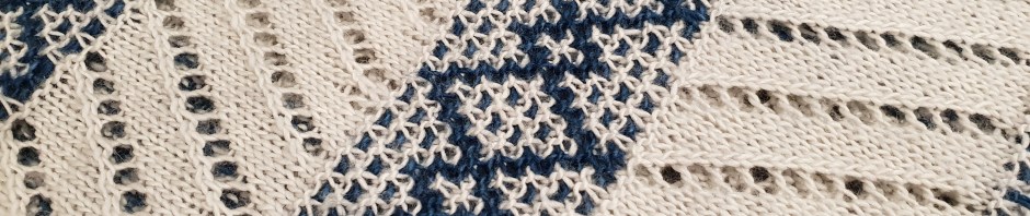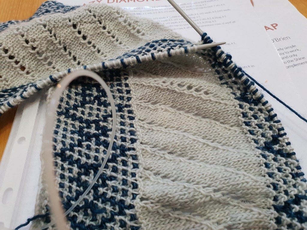 I love to make the patterns of gifted knit artists/designers. The Crazy Diamond Wrap pattern of Australian designer Ambah O’Brien (https://www.ravelry.com/designers/ambah-obrien) intrigued me as it promised a complex-looking result from an “easy to work” pattern.