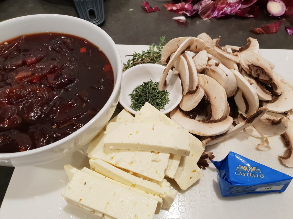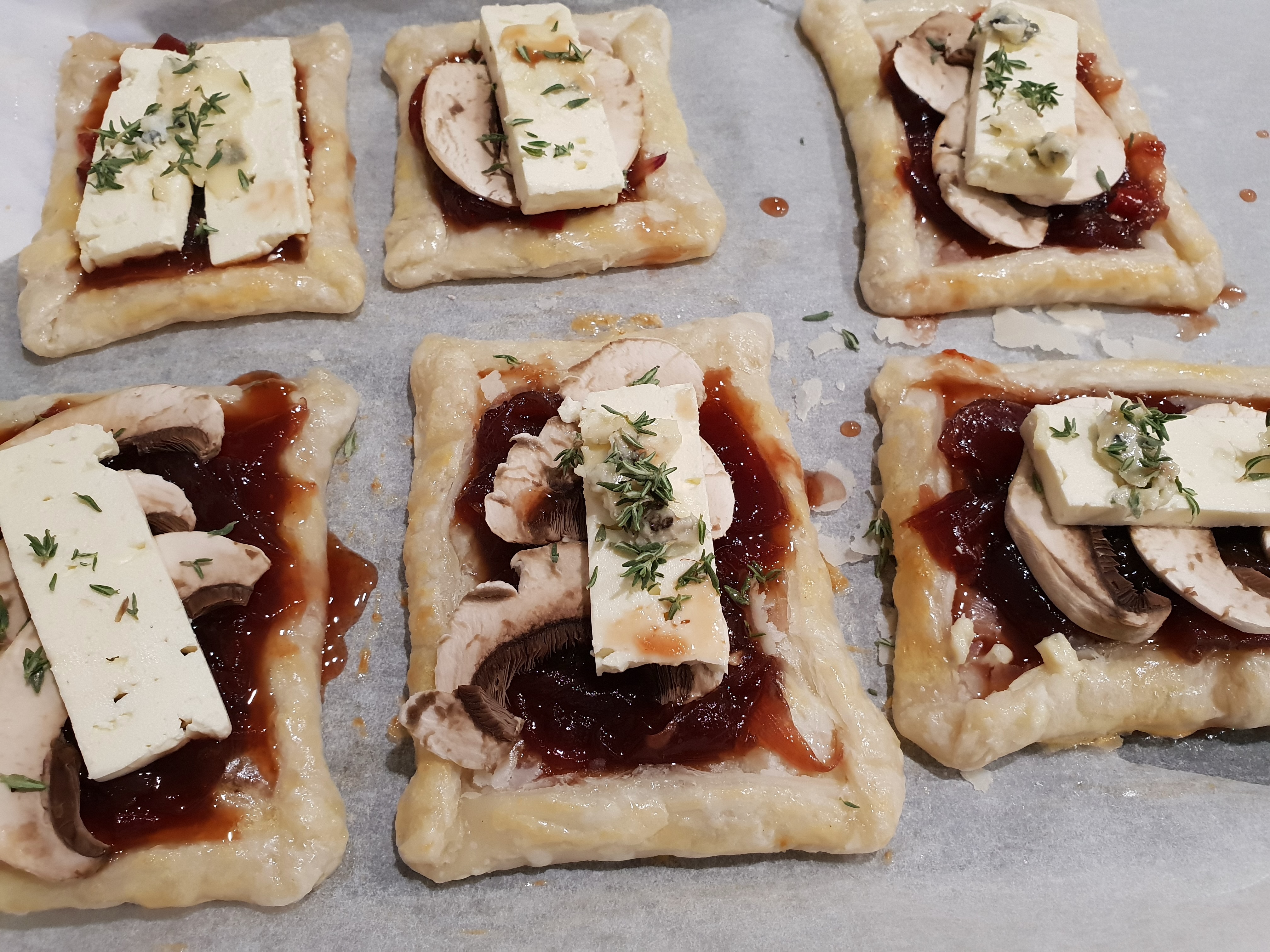 Above: Red onion chutney with mushroom, feta, blue cheese and thyme to fill tart cases.