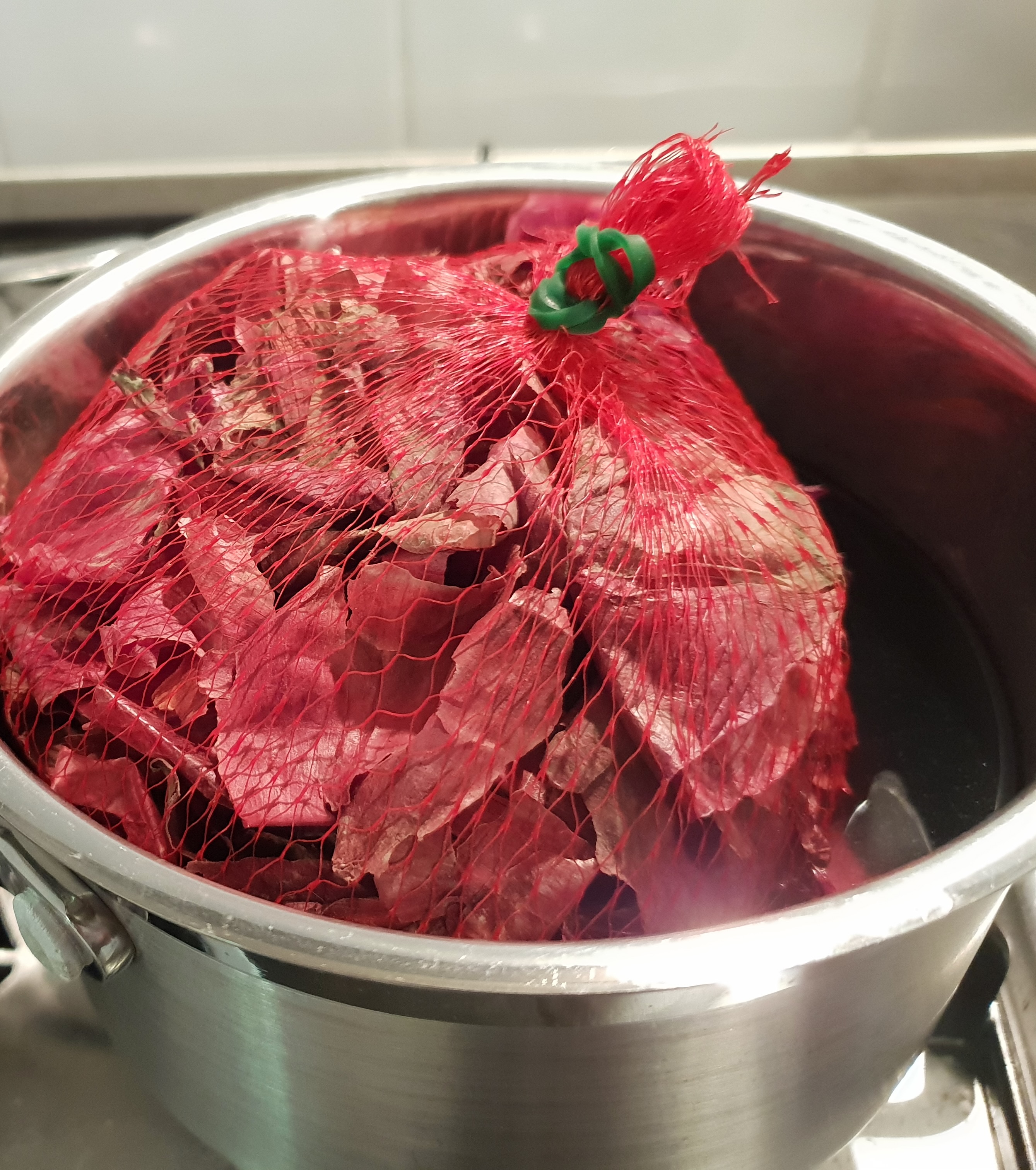 But, wait, there’s more. I now had the saved red onion skins from 500g of red onions dried and aching to yield their colour….So I bagged them and lowered them into a pot full of water over high heat.