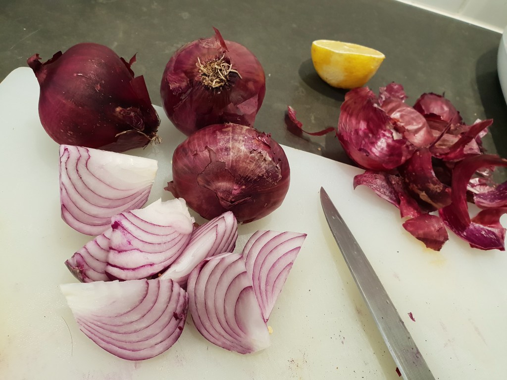 Below: 500g of red onions being peeled and sliced. Note the skins as a product.