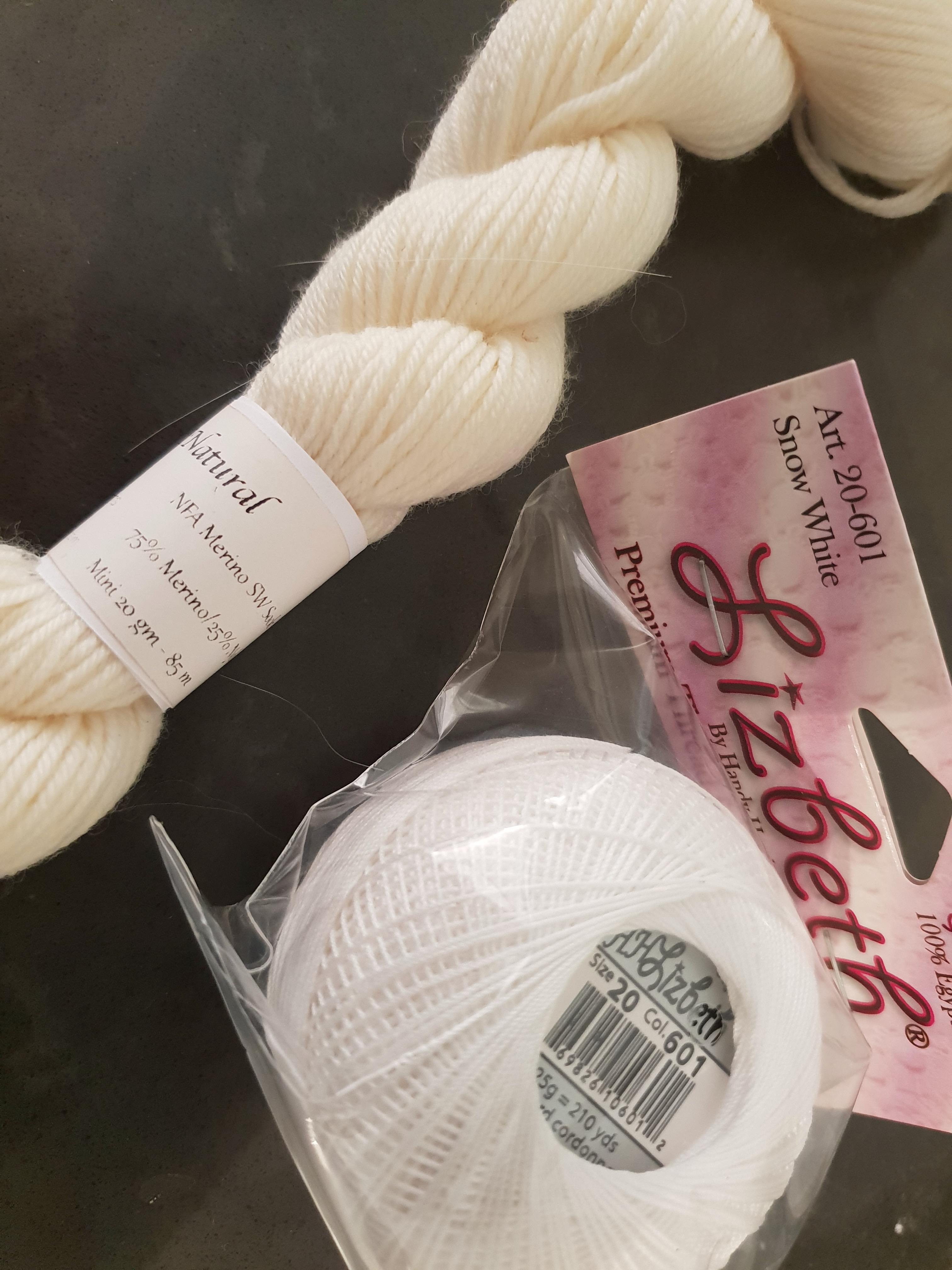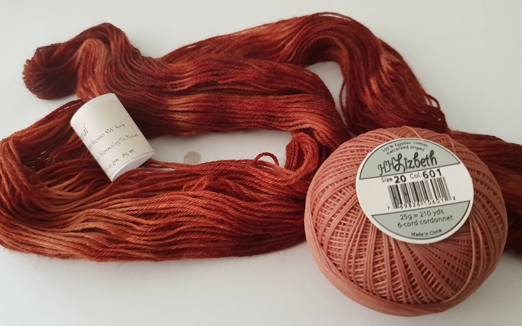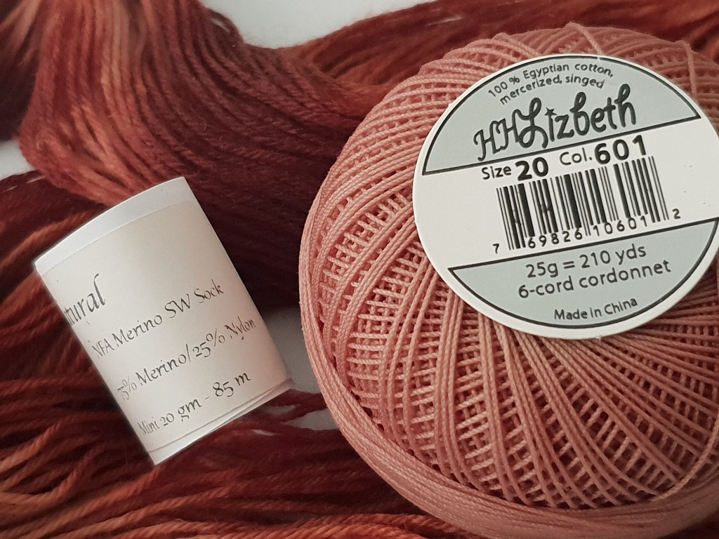 Above: while the water and dried red onion skins were warming, I pulled out a 25g mini skein of cream sock yarn (75% merino wool; 25% nylon) and a ball of No. 20 mercerised crochet cotton in white.