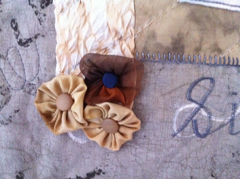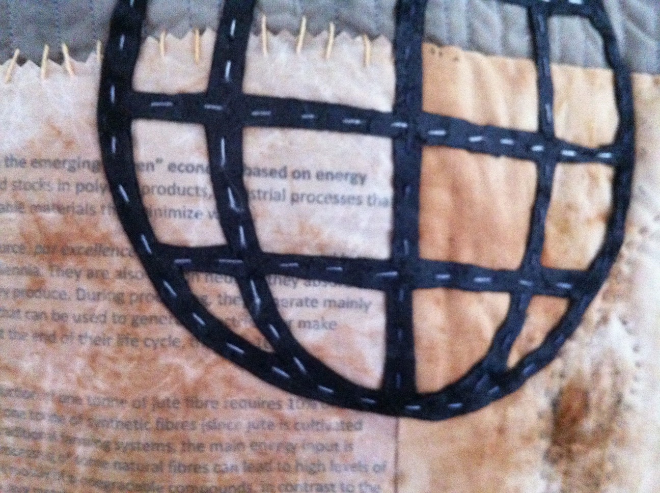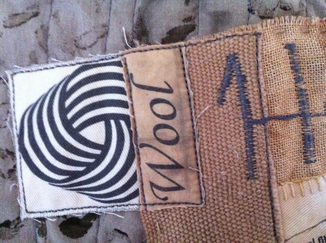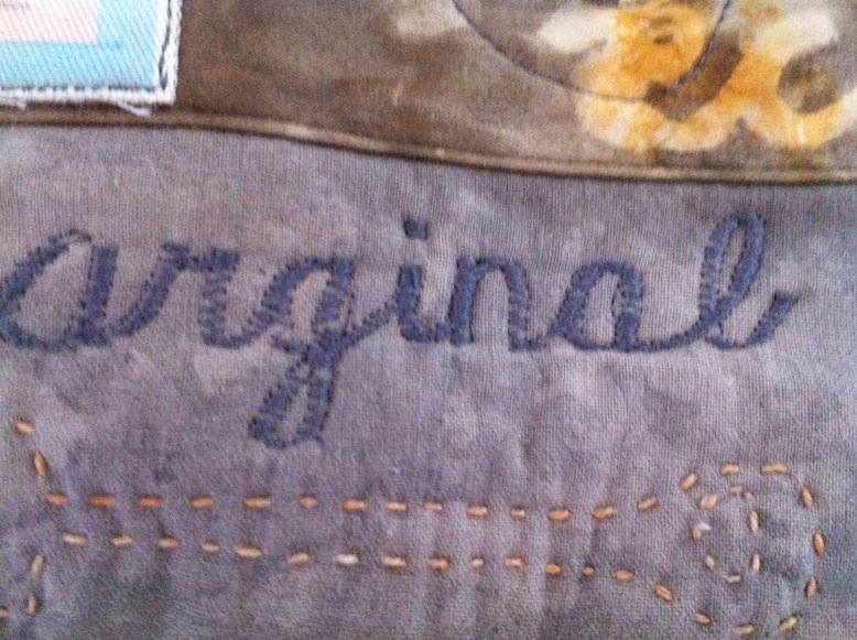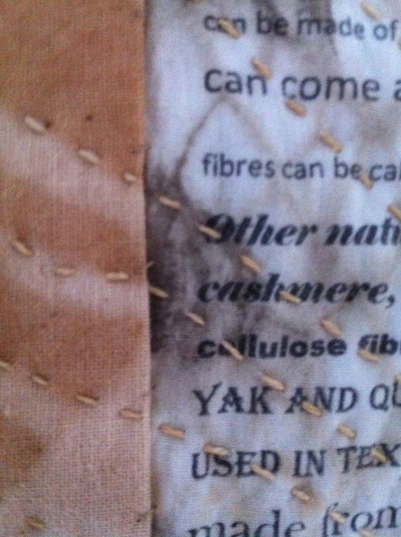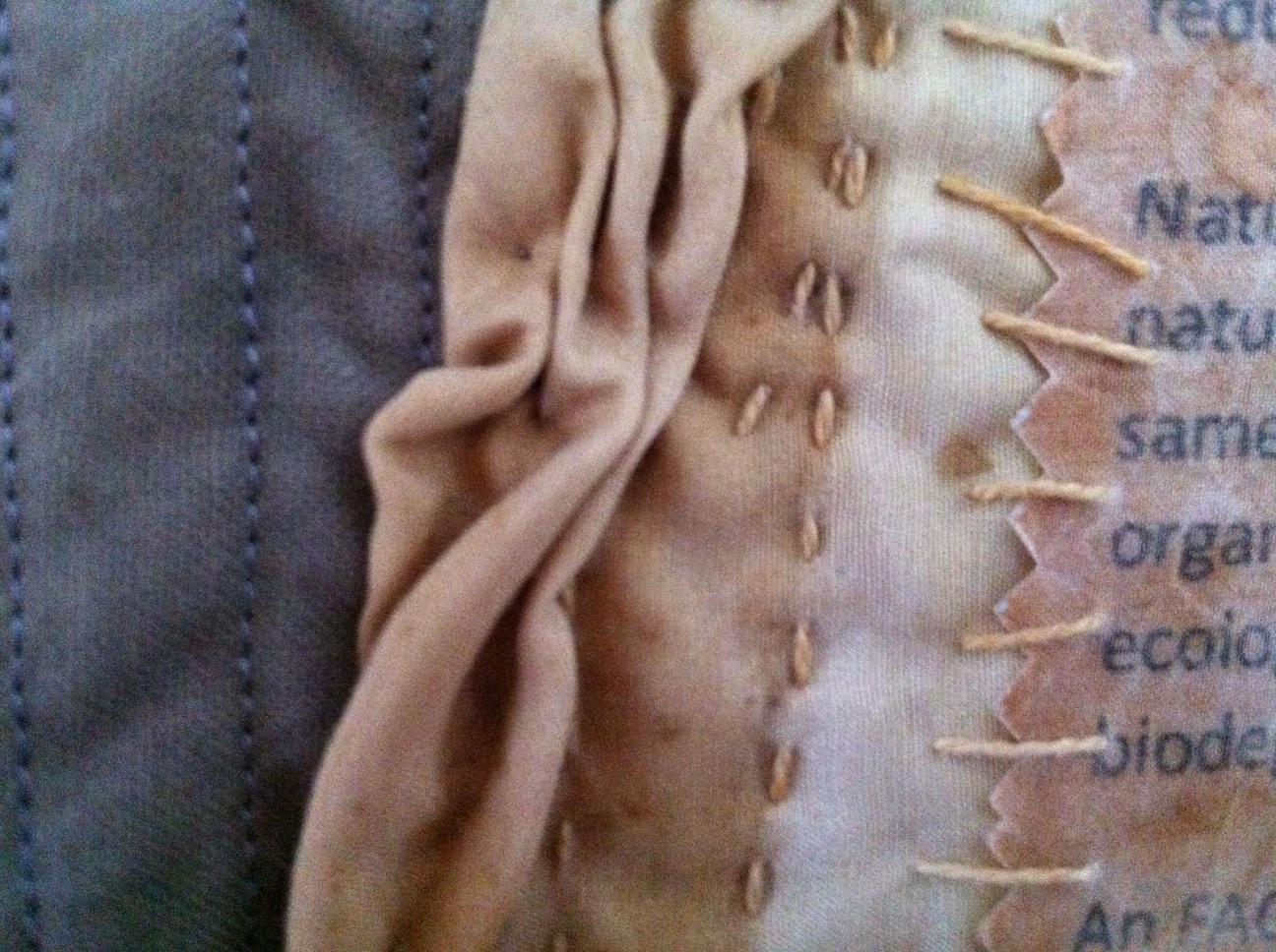 Below are some detail shots of a few of the modules. Fabric was hand dyed with pomegranate, tea, wandoo bark or avocado pips. Other fabric was given an iron wash and rusted or painted over using a flour resist and/ or home made stamps. Text from the official site of the International Year of the Natural Fibre was transferred to commercial fabric purchased for the purpose and then hand dyed.fabric. The work incorporates labels from clothing, hand woven fabrics, buttons and fabric manipulation. Above all, there is a lot of ma