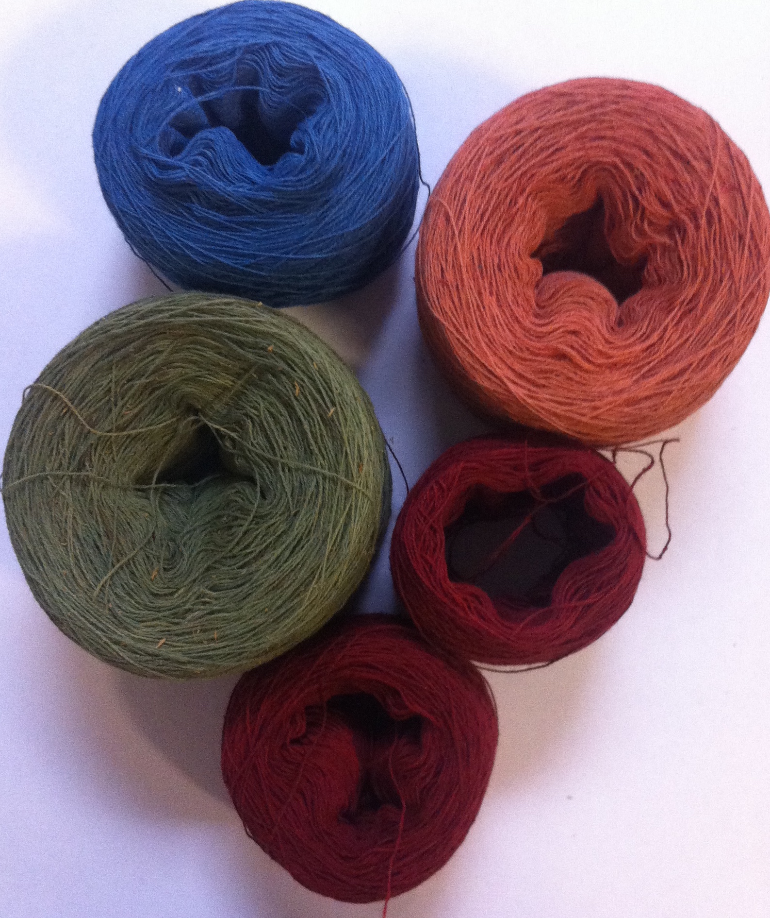The green shade is achieved with a mix of indigo and mango bark. Thus it’s a darker, more muted green than the lime one made in the north from pandanus leaves. As you can see from the photo, the quantity of thread in each skein varied (I made two balls from the dark red skein). The above are all weft threads.
